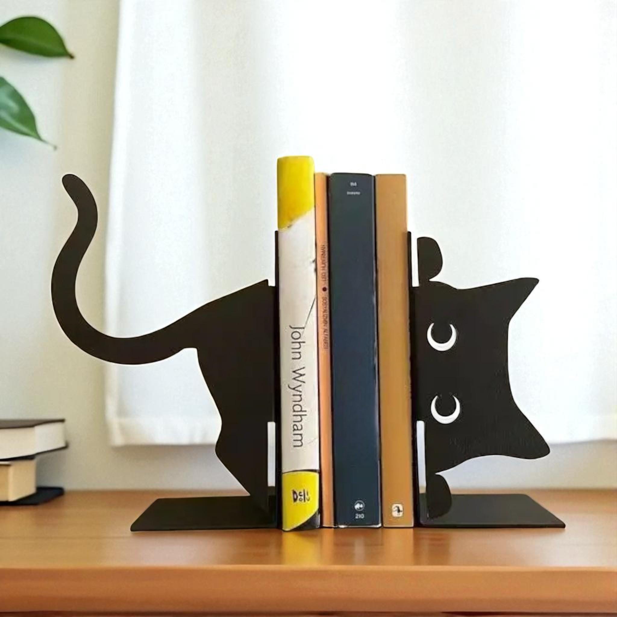 Black Cat Metal Bookends - Cute Animal Book Stopper for Shelves, Of...