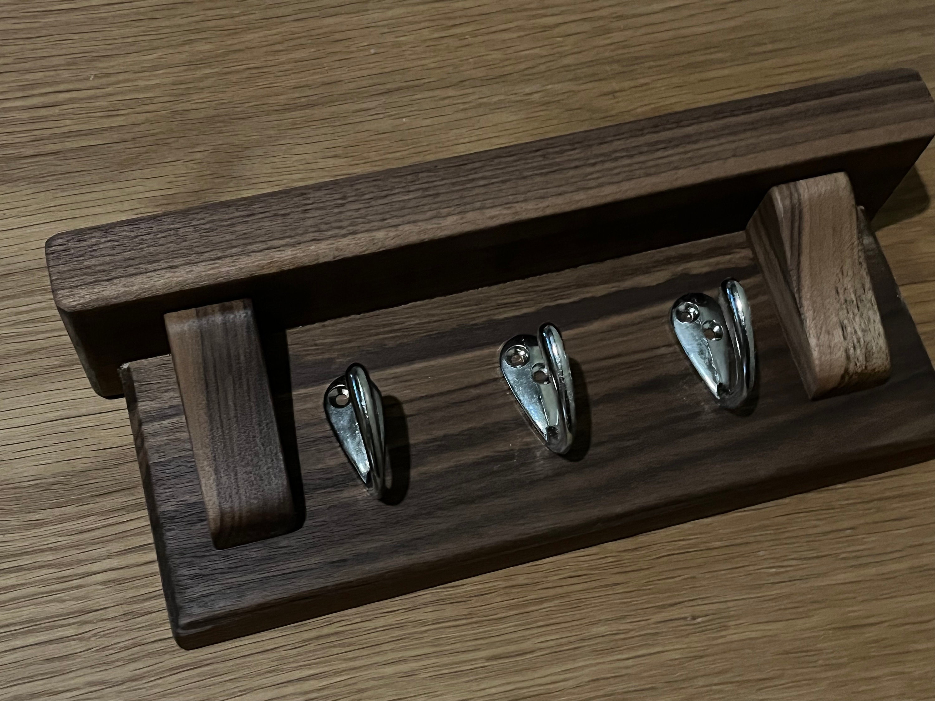 solid walnut key hanger or dog lead holder with 3 chrome hooks made from solid walnut with chrome ho...