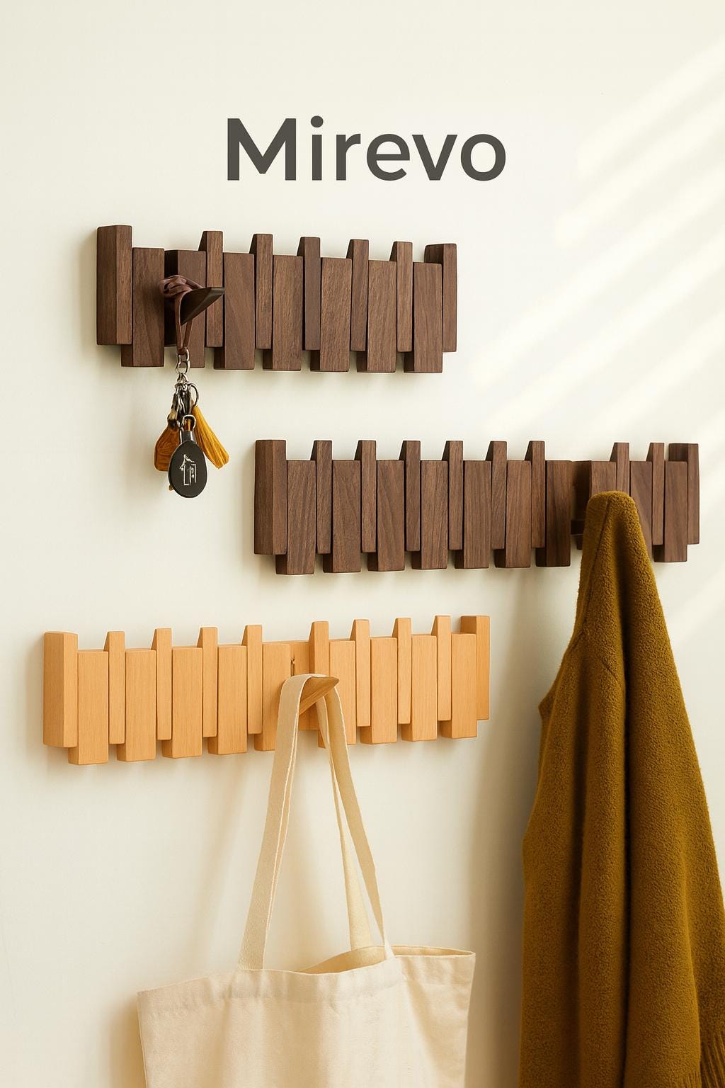 Offset piano key hooks, a collision of walnut and beech that unites the black and white characterist...