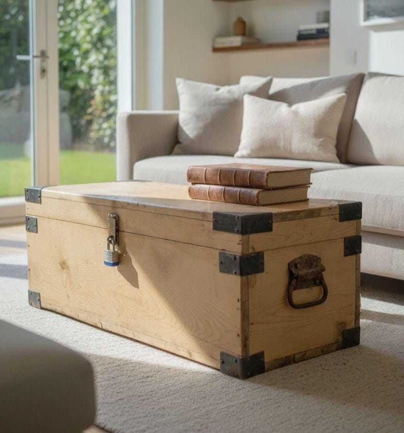 "Solid Wood storage trunk, made of reclaimed wood and featuring cast iron angle plates, handles...