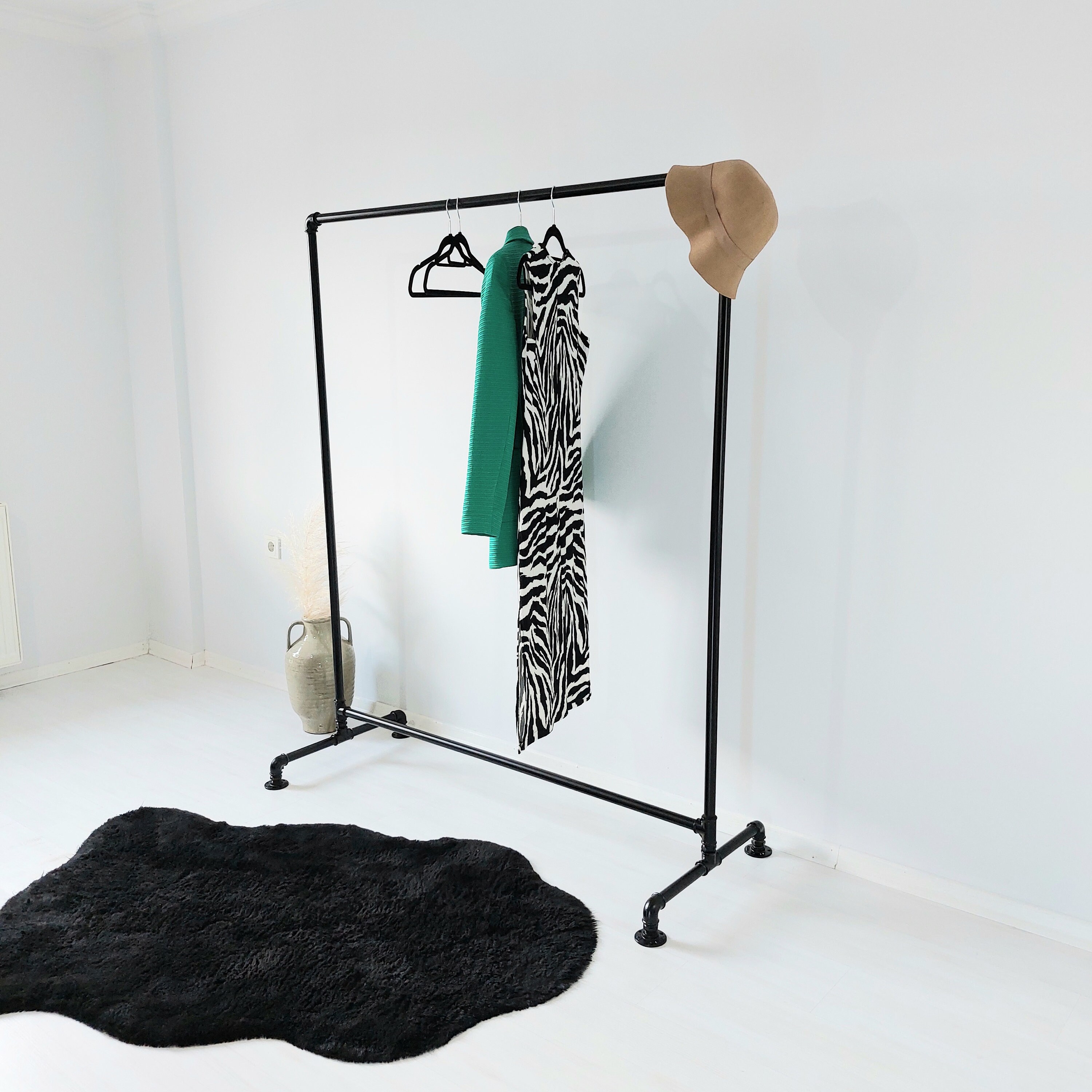 A heavy-duty, freestanding industrial clothing rail made from steel pipe. Built for strength and sty...