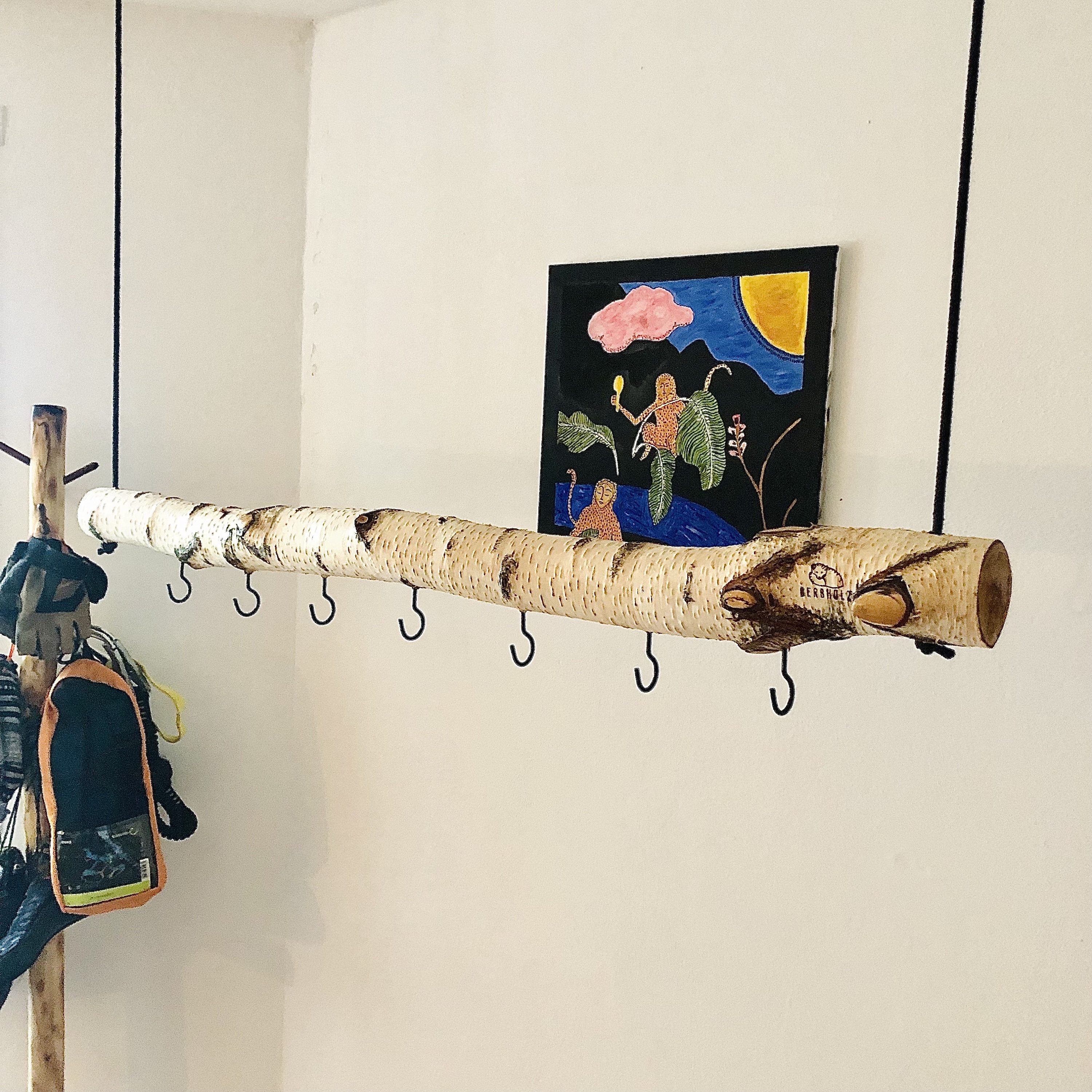 Sustainable clothes rail made from a birch branch made by Derbholz * Length: 1.20 m * 7 open hooks f...