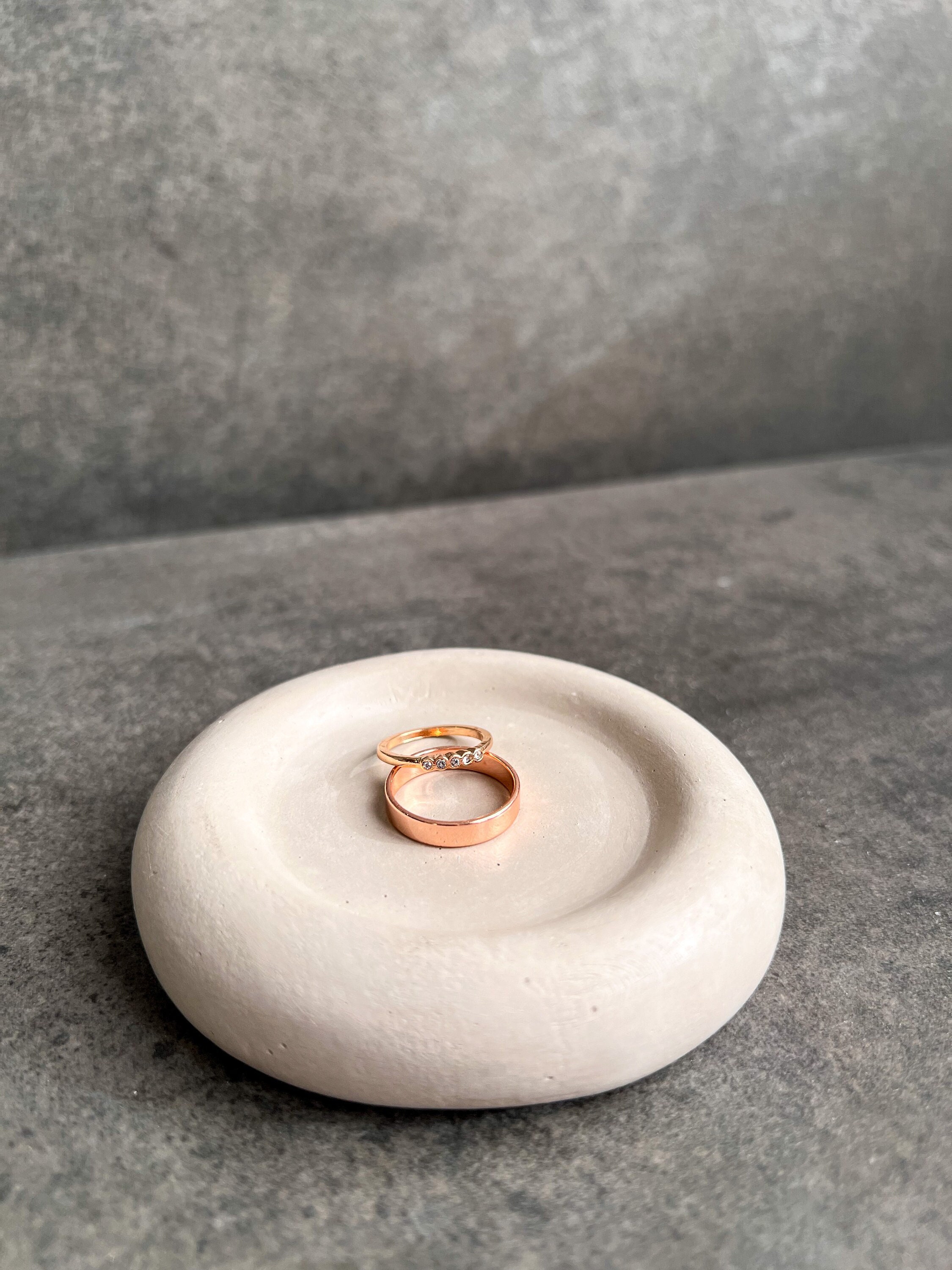 "This minimalist concrete dish can be used to hold jewelry or to add character to any bedroom, ...
