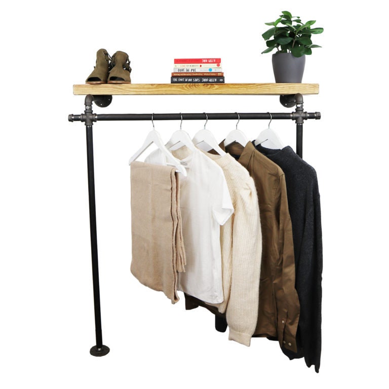 Industrial Elbow Clothes Rail With Solid Wooden Shelf | Industrial ...