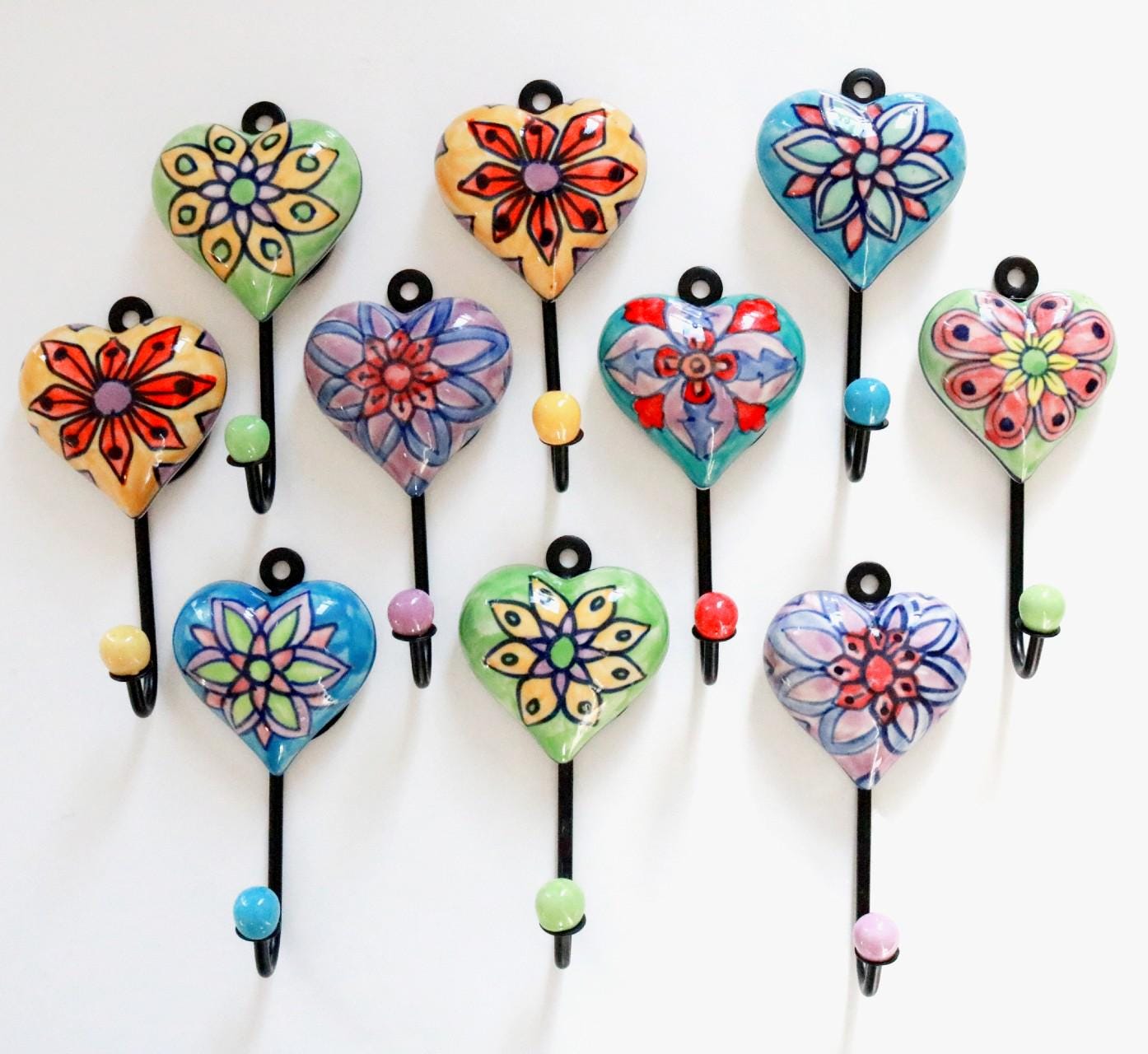 Traditionally handcrafted heart shaped ceramic hooks, displaying fantastic detail and brilliant colo...
