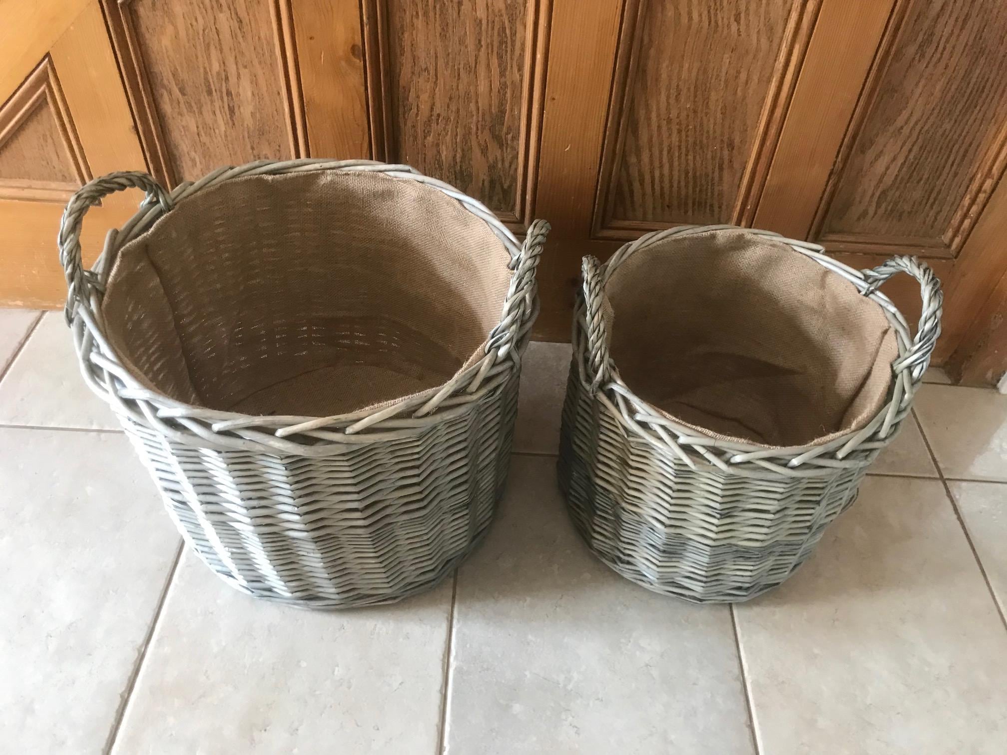 Full Antique Grey Wash Finish Brown Round Straight Sided Lined Log/Storage Baskets in 2 Sizes: Mediu...