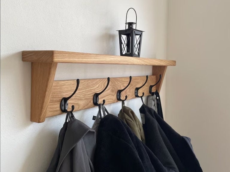 Handmade SOLID OAK Coat Rack with Shelf, Wooden Entryway Shelf with...