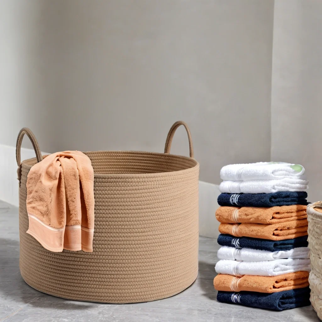 Large Blanket Basket, Woven Laundry Basket With Long Handles, Toy Storage Bin, Decorative Round Cott...