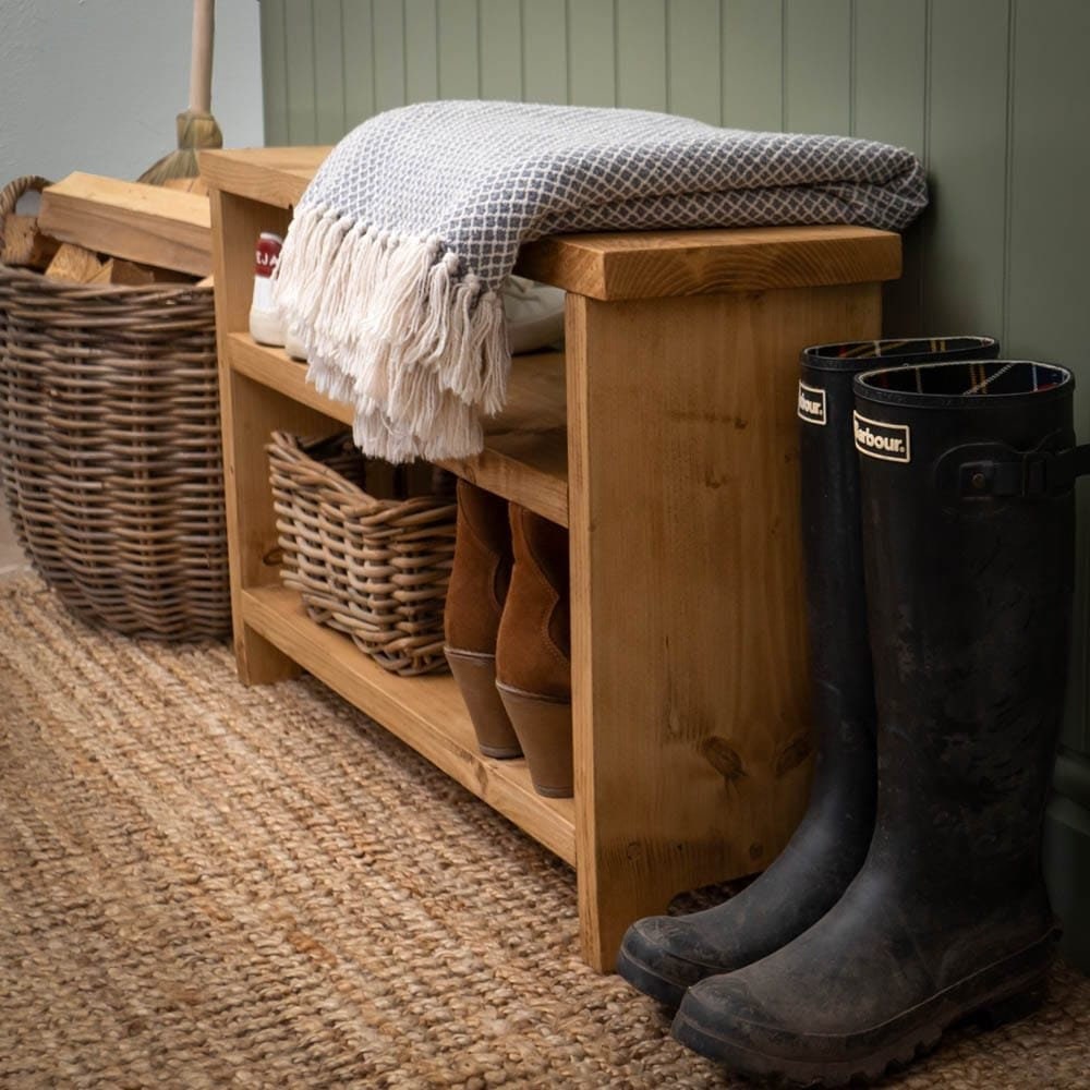 Hand crafted solid pine rustic reclaimed shoe bench with internal fixed shelf Completely hand made f...