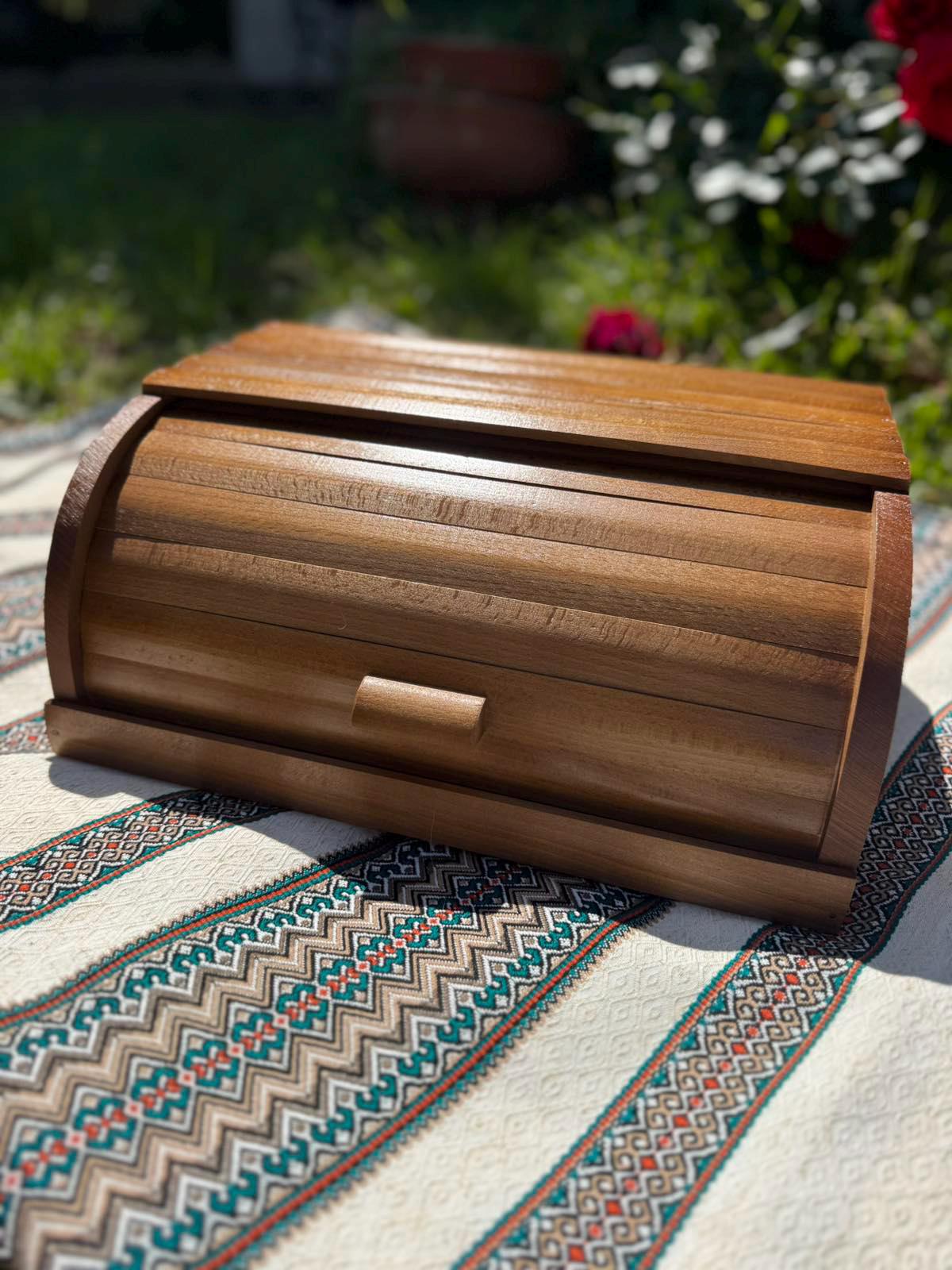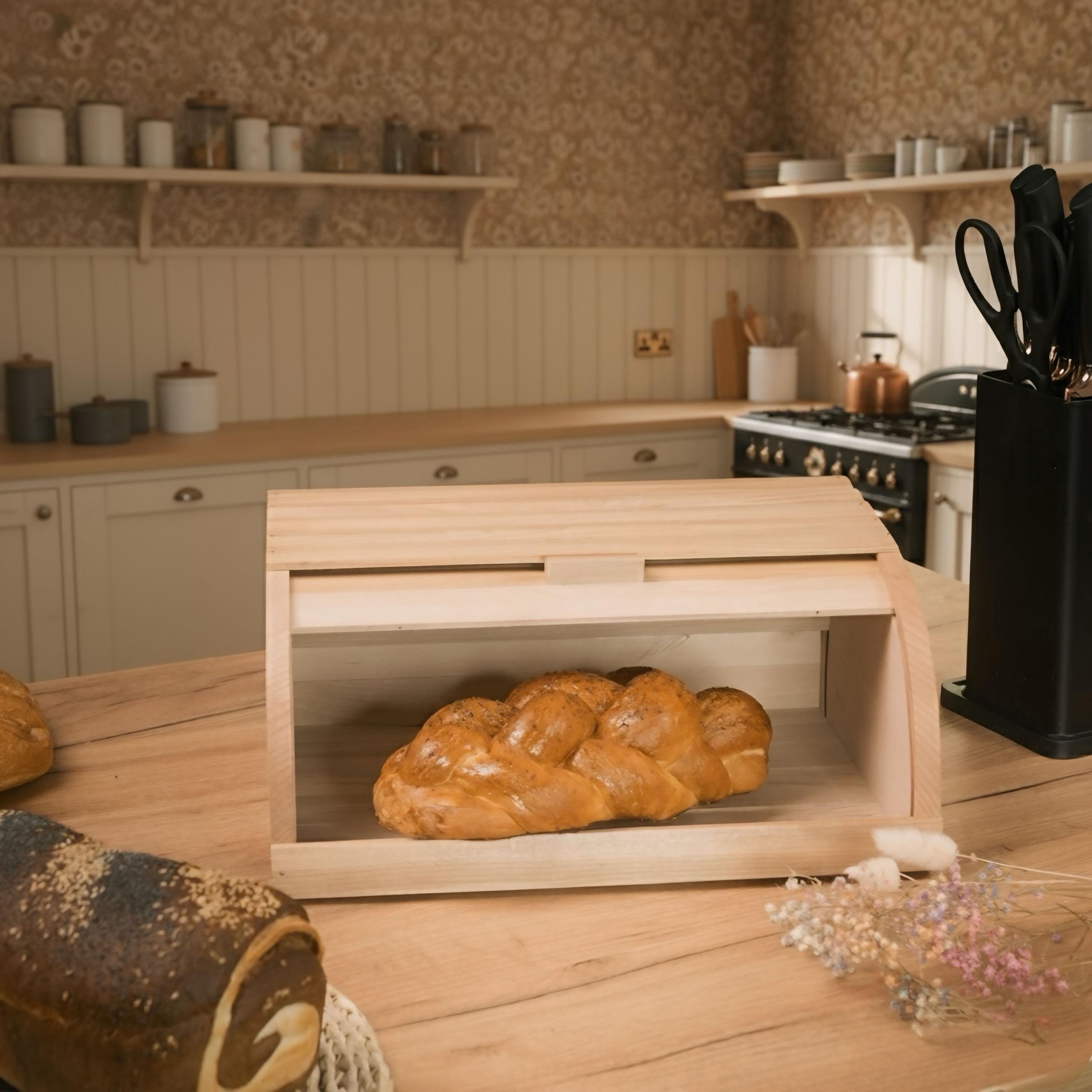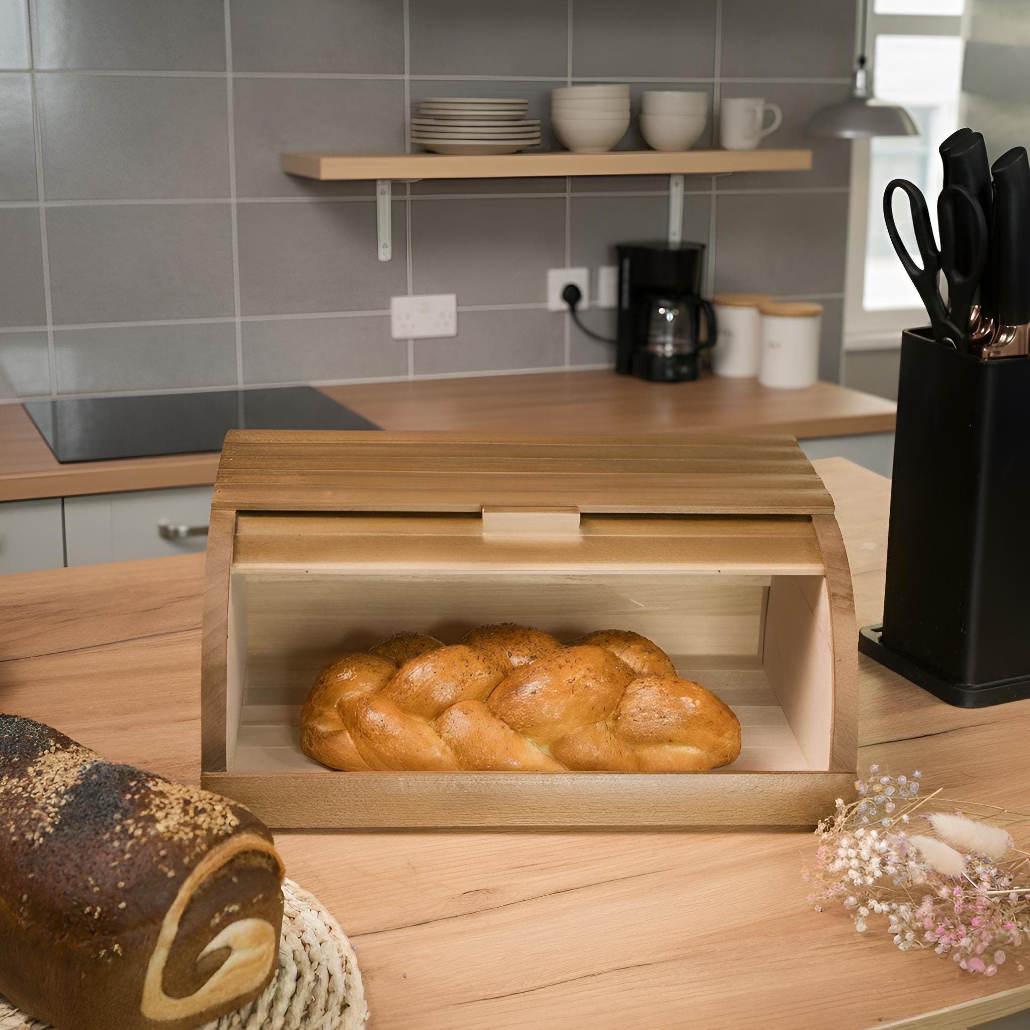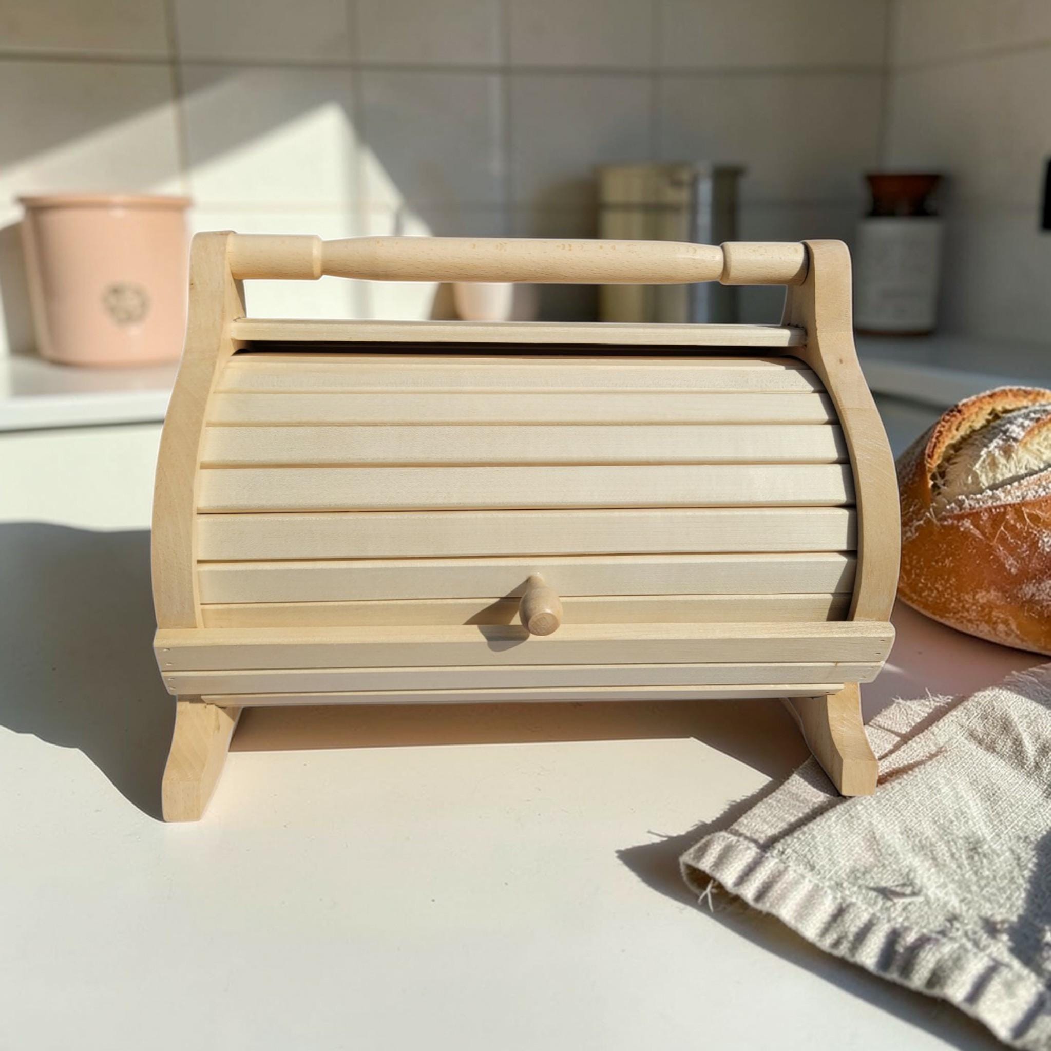 A handcrafted wooden bread box with a space-saving roll-top lid, perfect for keeping your bread fres...