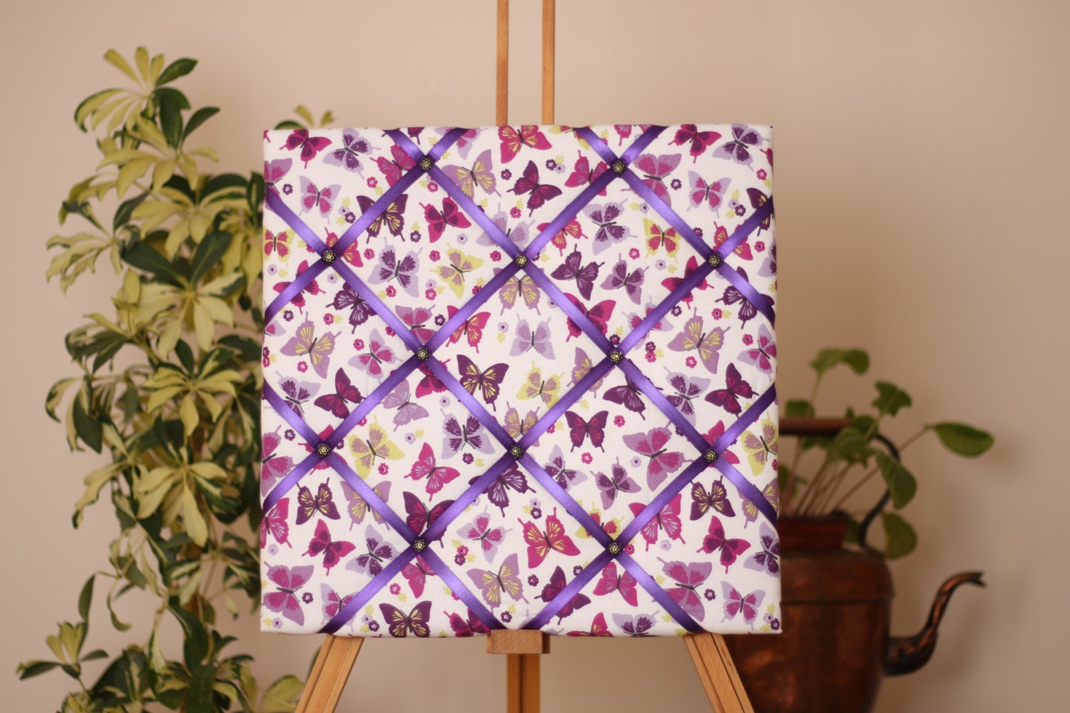 Pictured is a 40x40cm handmade notice board made using purple flutterby butterfly fabric and finishe...
