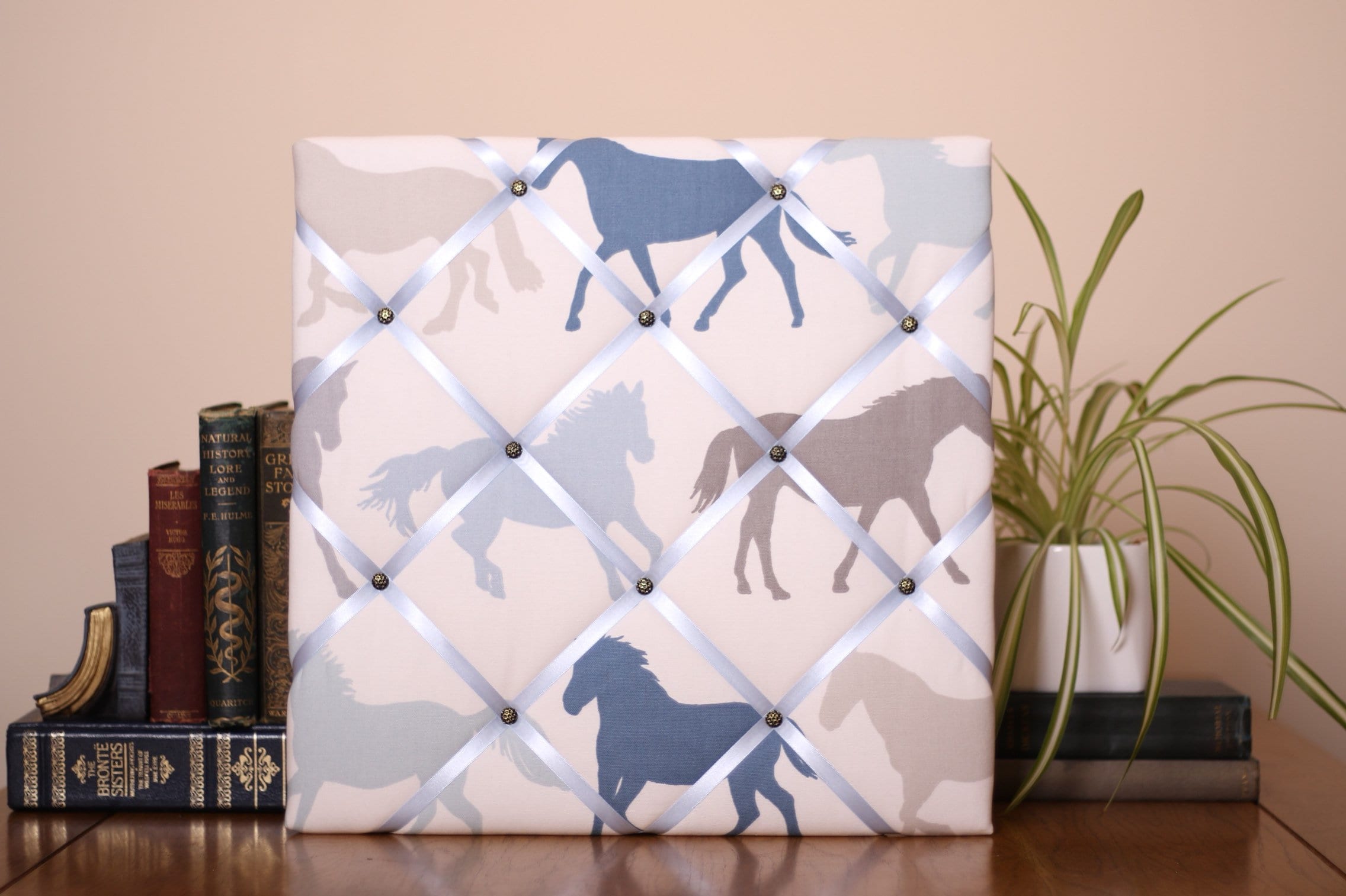 Pictured is a 40x40cm handmade notice board made using Clarke & Clarke Stampede horse & foal...
