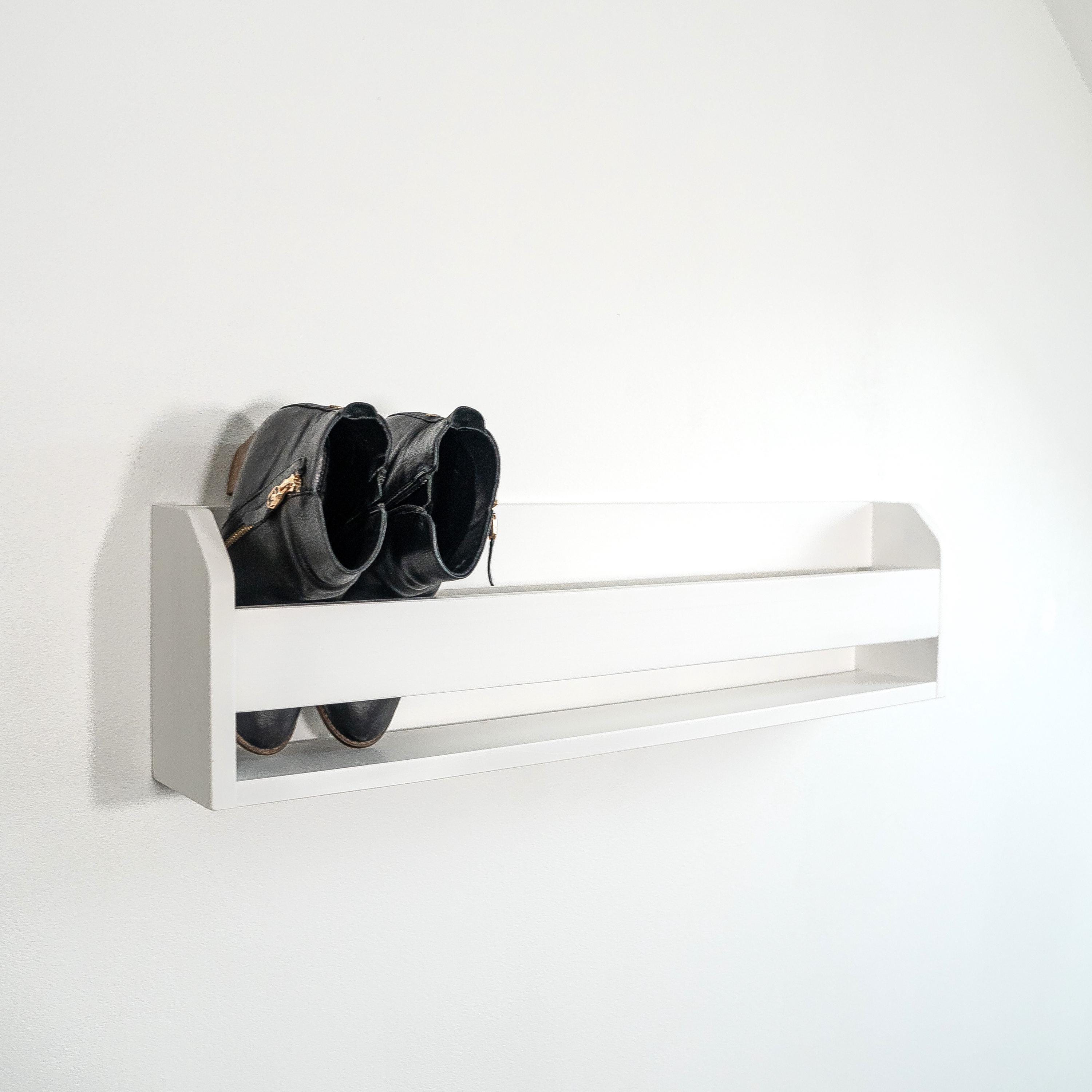 "Handcrafted oak shoe rack, wall mounted for hallway or entryway. Stylish, sustainable shoe sto...