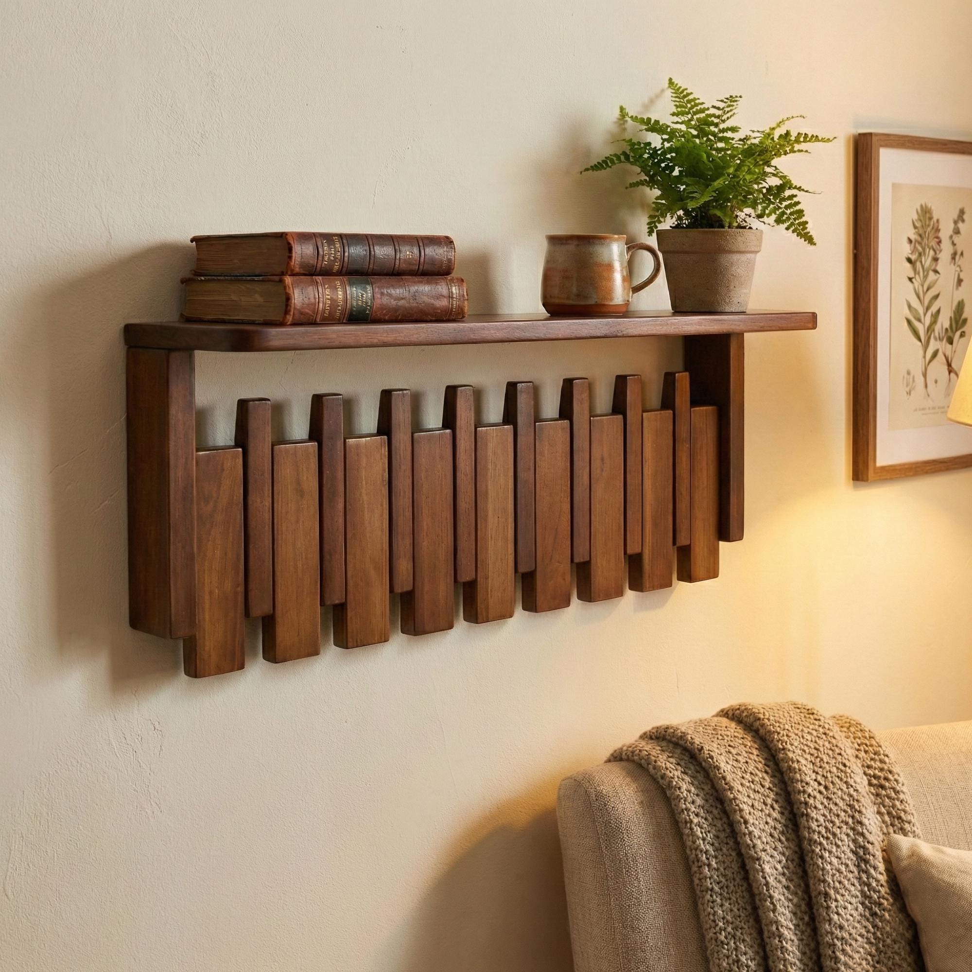 Piano Coat Rack with Shelf, Solid Wood Wall Hooks, Walnut Floating ...