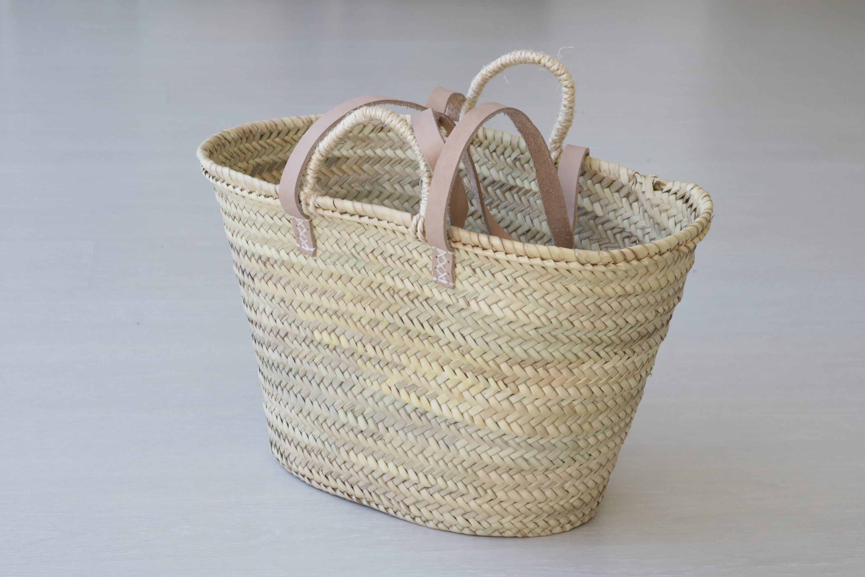 Natural Basket with long leather handles. Wild palm material. Size approx: Height: 25 cm / 9.8 in Wi...