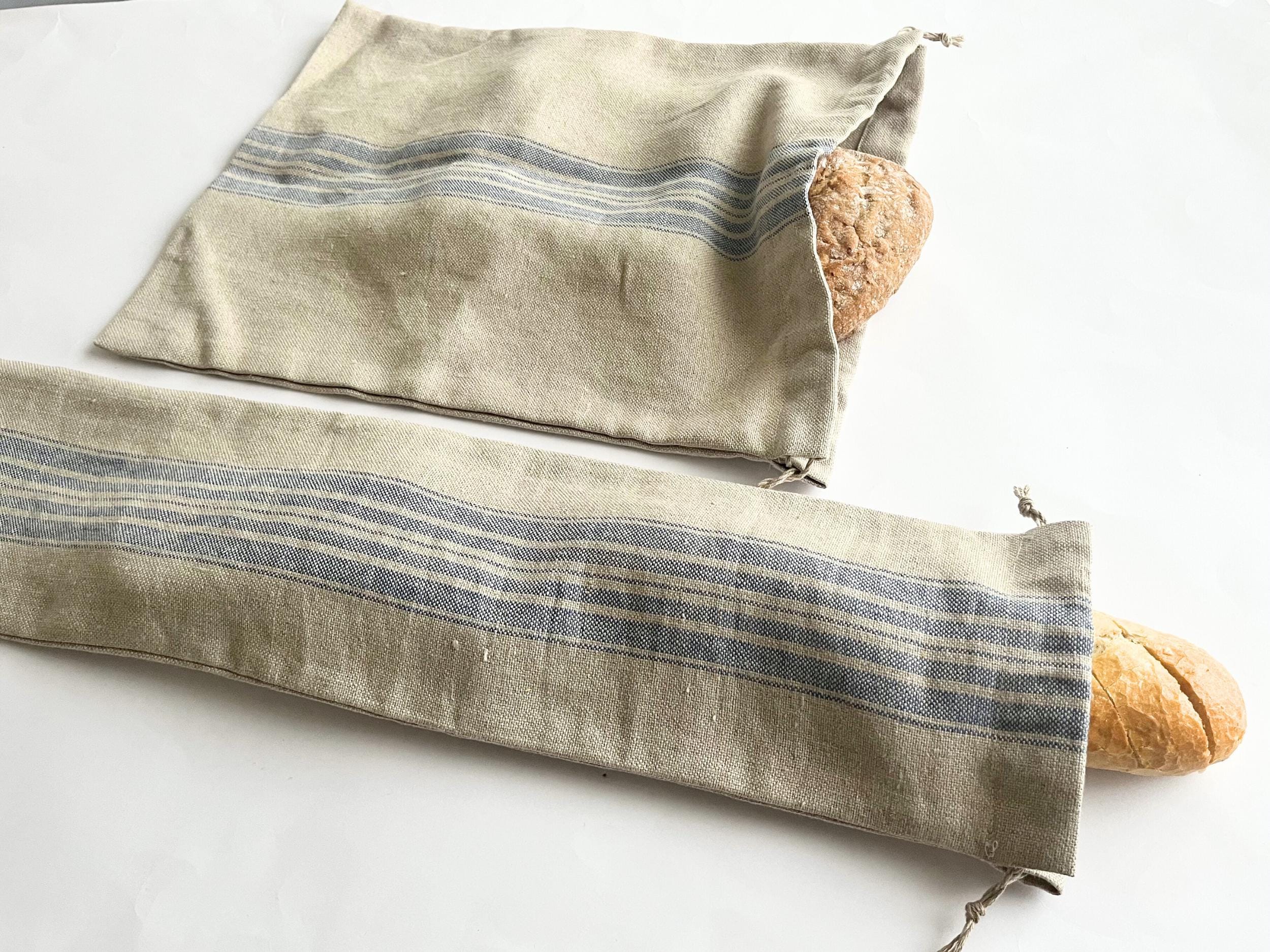 Linen bread bag and baguette bag set with blue stripes. Striped zer...