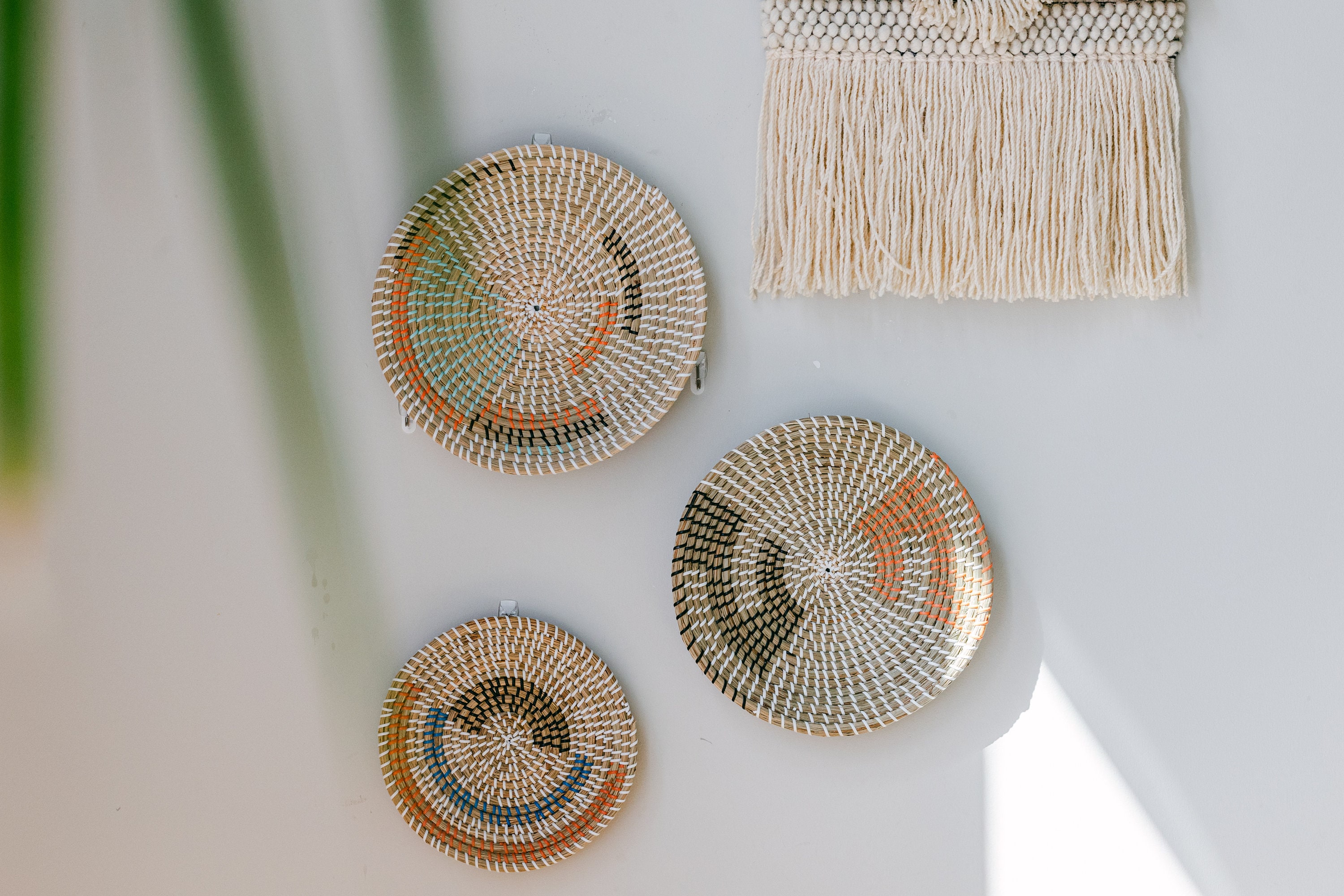 Three-piece set of decorative baskets made from raffia and grass. These African-style wall baskets a...