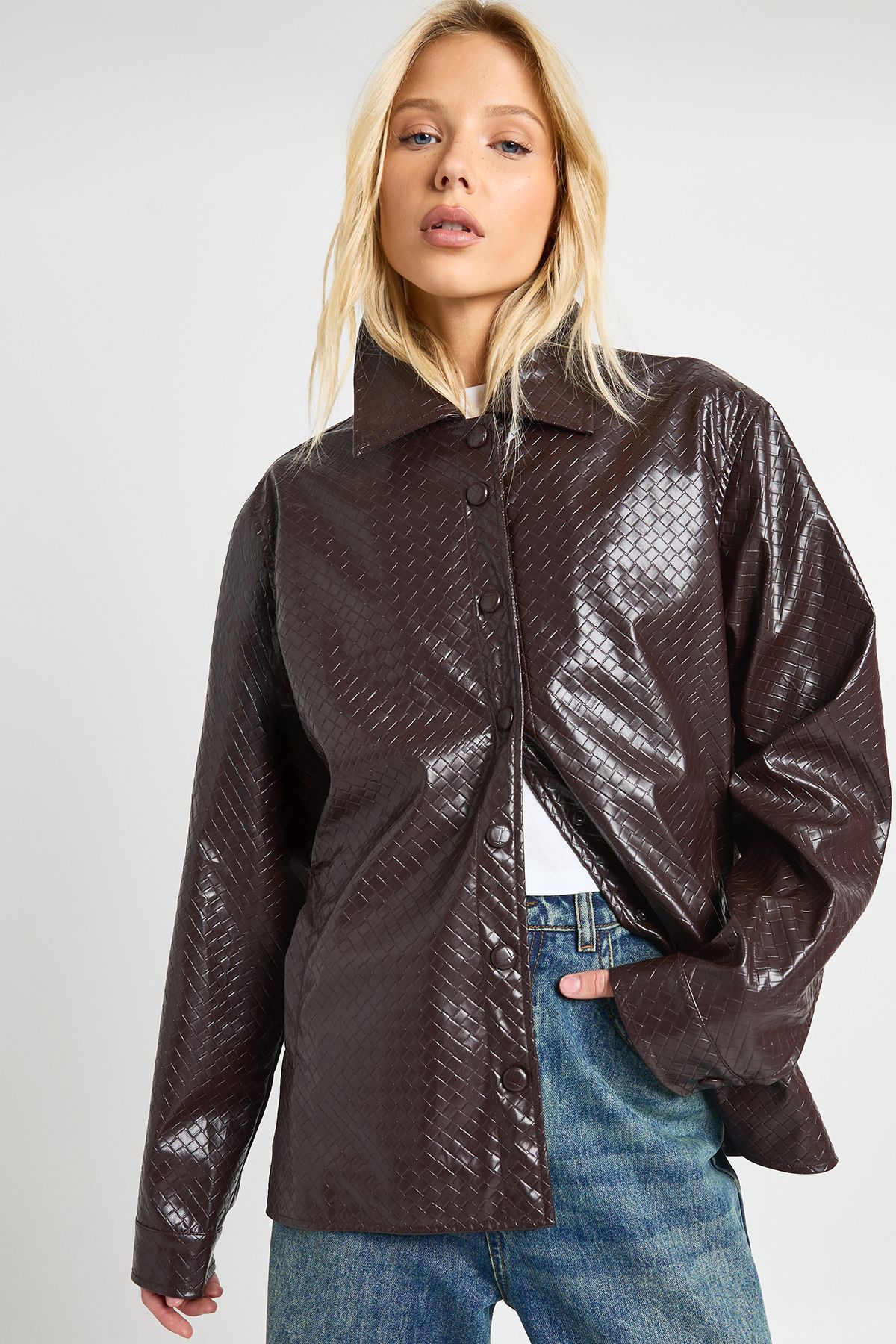 Boohoo Womens Textured Faux Leather Shacket - Chocolate - Size 8 UK...