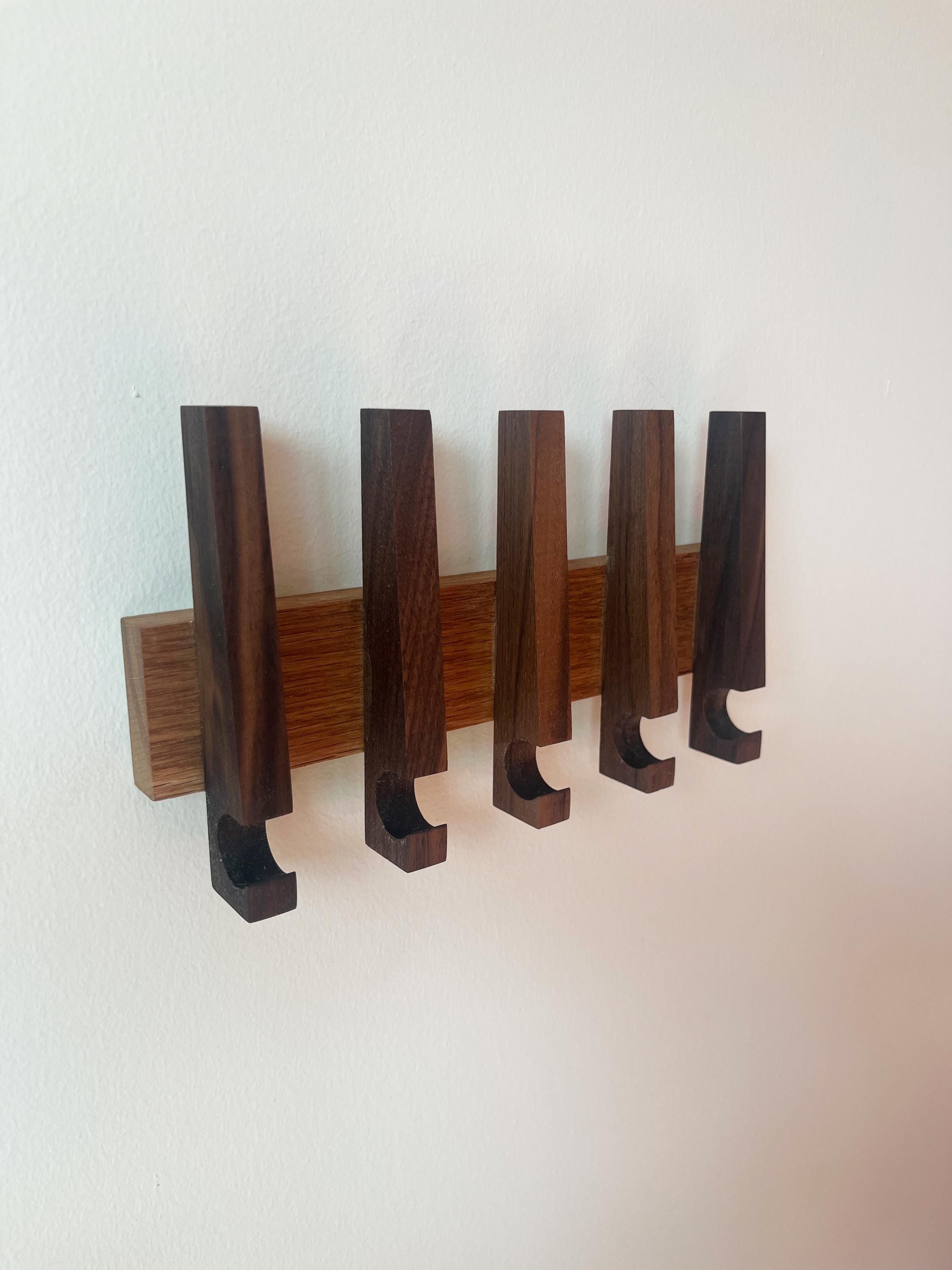 "Handcrafted out of solid walnut and white oak, this Mid-Century Modern key hook rack brings ti...