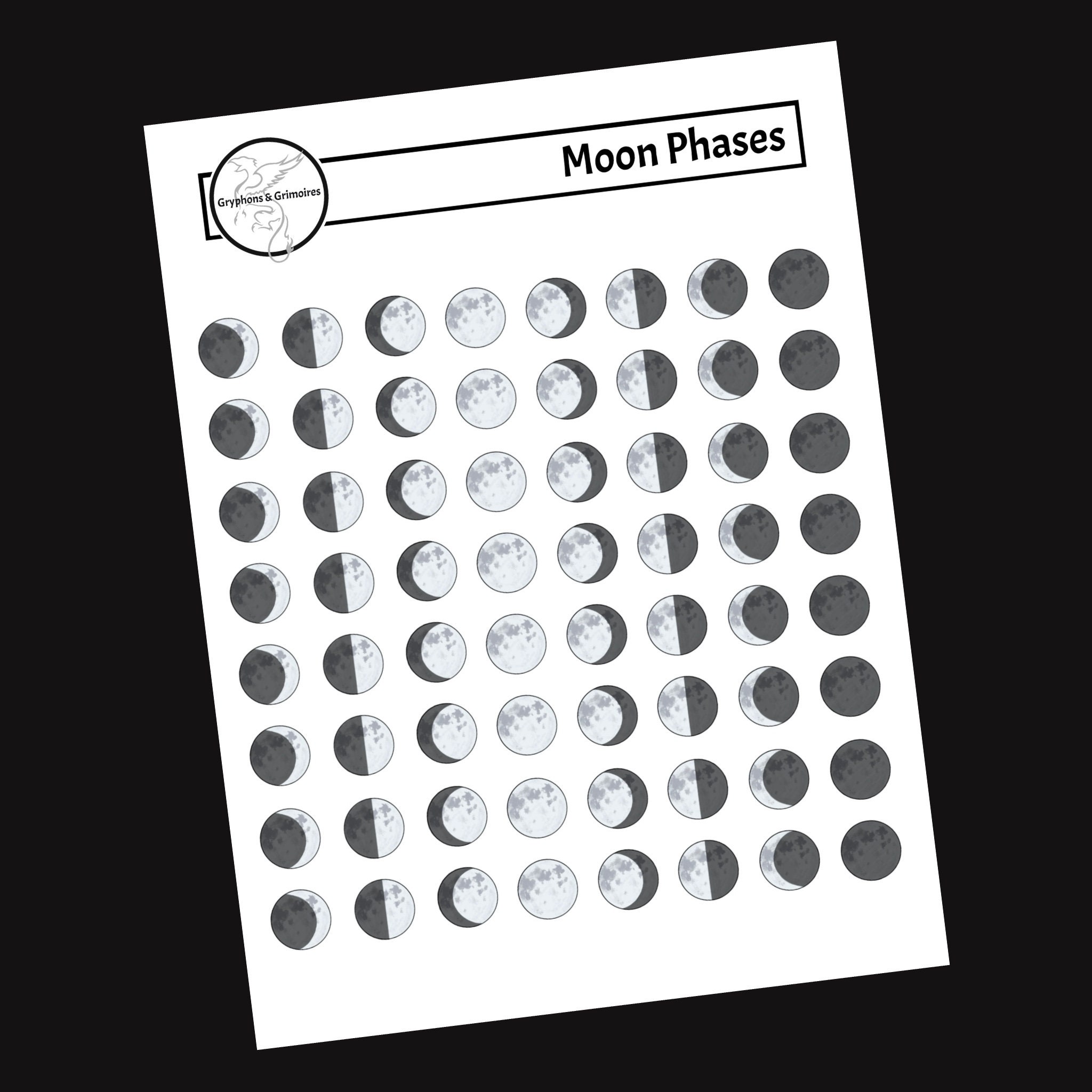 Moon phase decorative stickers. Each sheet includes 64 kiss-cut stickers, ready to use in your journ...