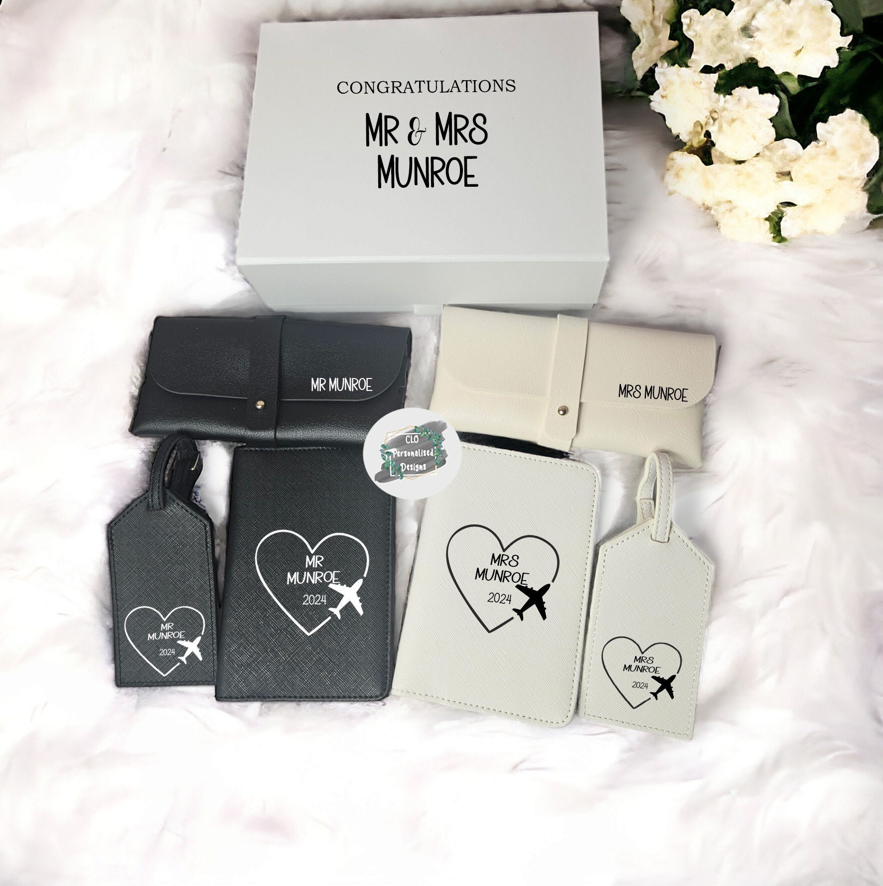 Beautiful Mr & Mrs Honeymoon Travel gift set, available to purchase with plain or personalised g...