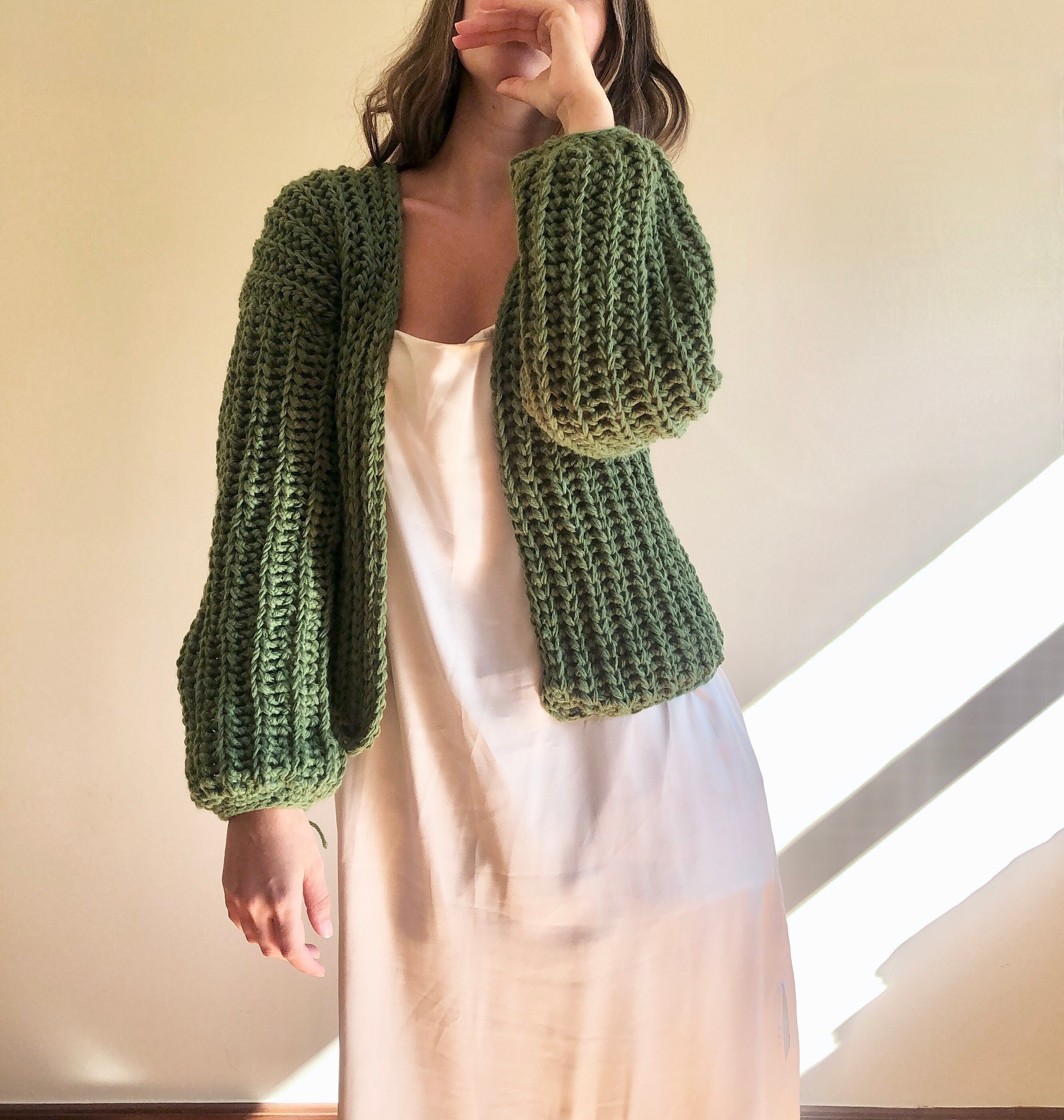 Crop knit cardigan, green knit oversize sweater, chunky wool cardig...