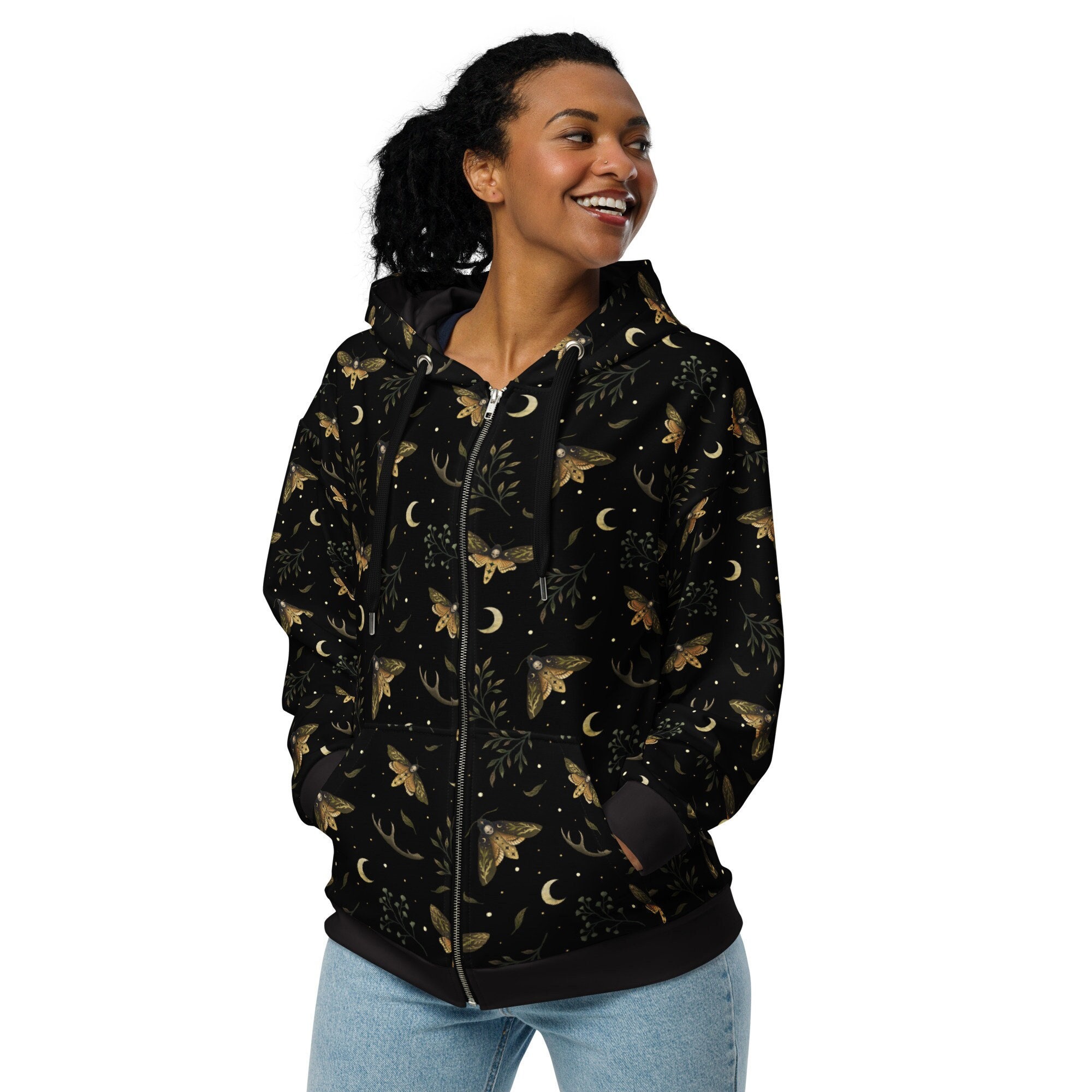 "Death Head Hawkmoth Recycled Zip up Hoodie, Dark Cottagecore Zip Jacket, Moth & Moon Hoodi...