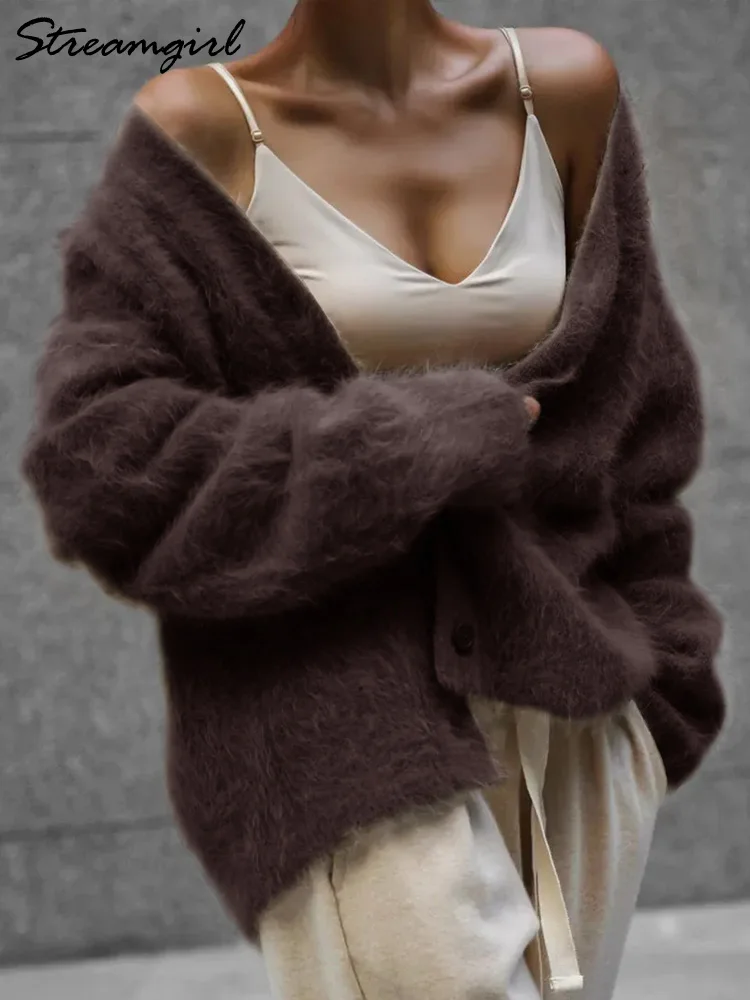 Brown Thick Cardigan Jackets For Women Loose Olive Green Cardigan Luxury Winter Knitwear Oversized I...