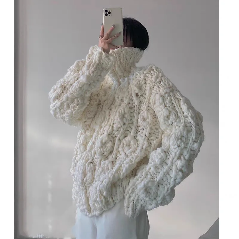 New autumn and winter personalized white high neck three-dimensional pattern sweater women's coarse ...