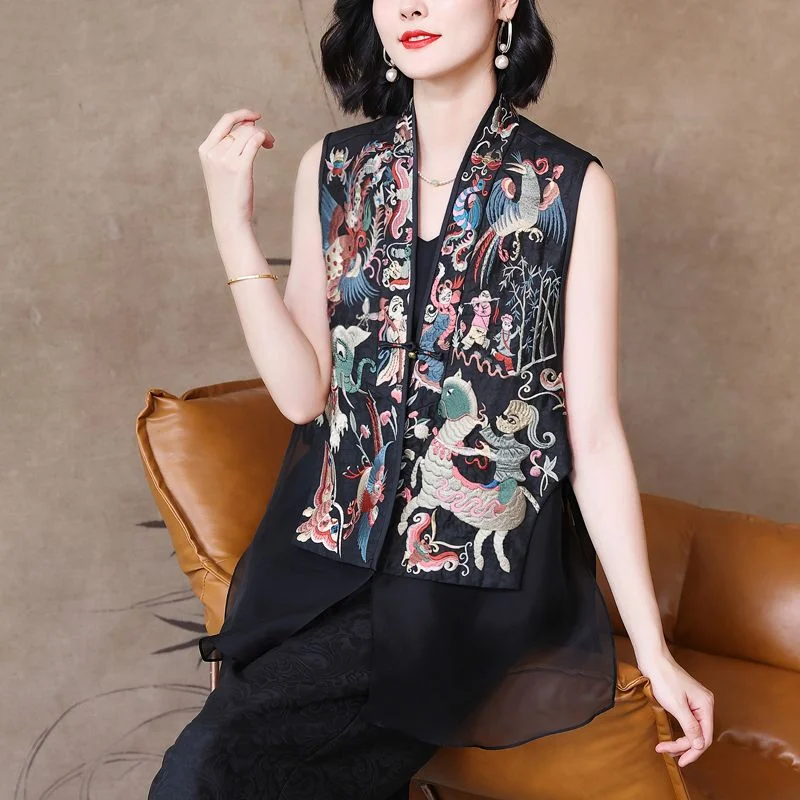 Vintage Chinese Style Vests Jacket Stitched Mesh Embroidered Buckle...