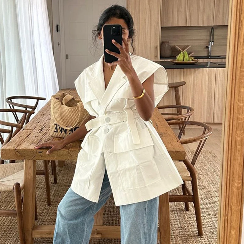 TARUXY Summer Sleeveless Work Shirt Multi-Pocket Belted Loose Top F...