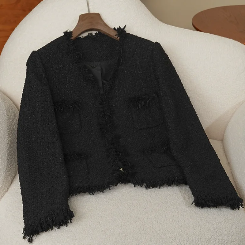 Black Fragrance V-neck Tassel Tassel Hook Buckle Short Coat Women Fashion Simple Versatile French Au...