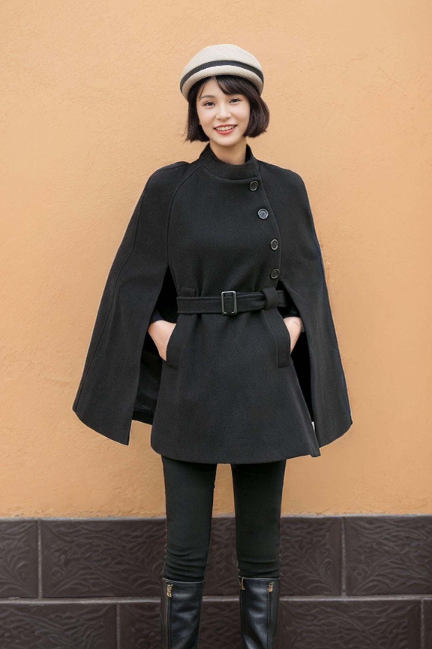 "Welcome to my Ylistyle's shop!!! This black cape wool coat, wear it in autumn and winter to ke...
