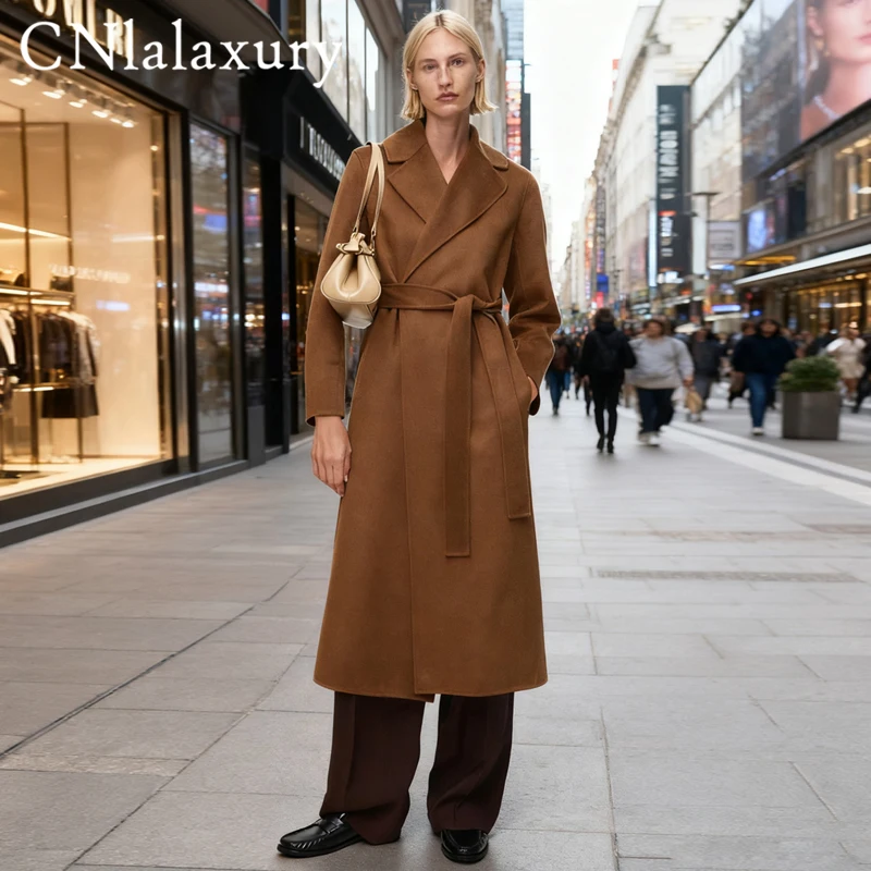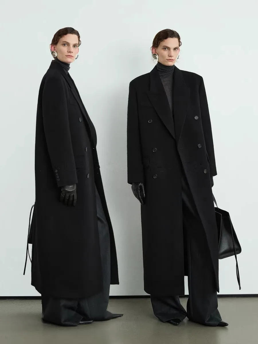 High-end Winter Cashmere Coat Women Camel Color Long Black Wool Coat Classic Double-breasted Lace-up...