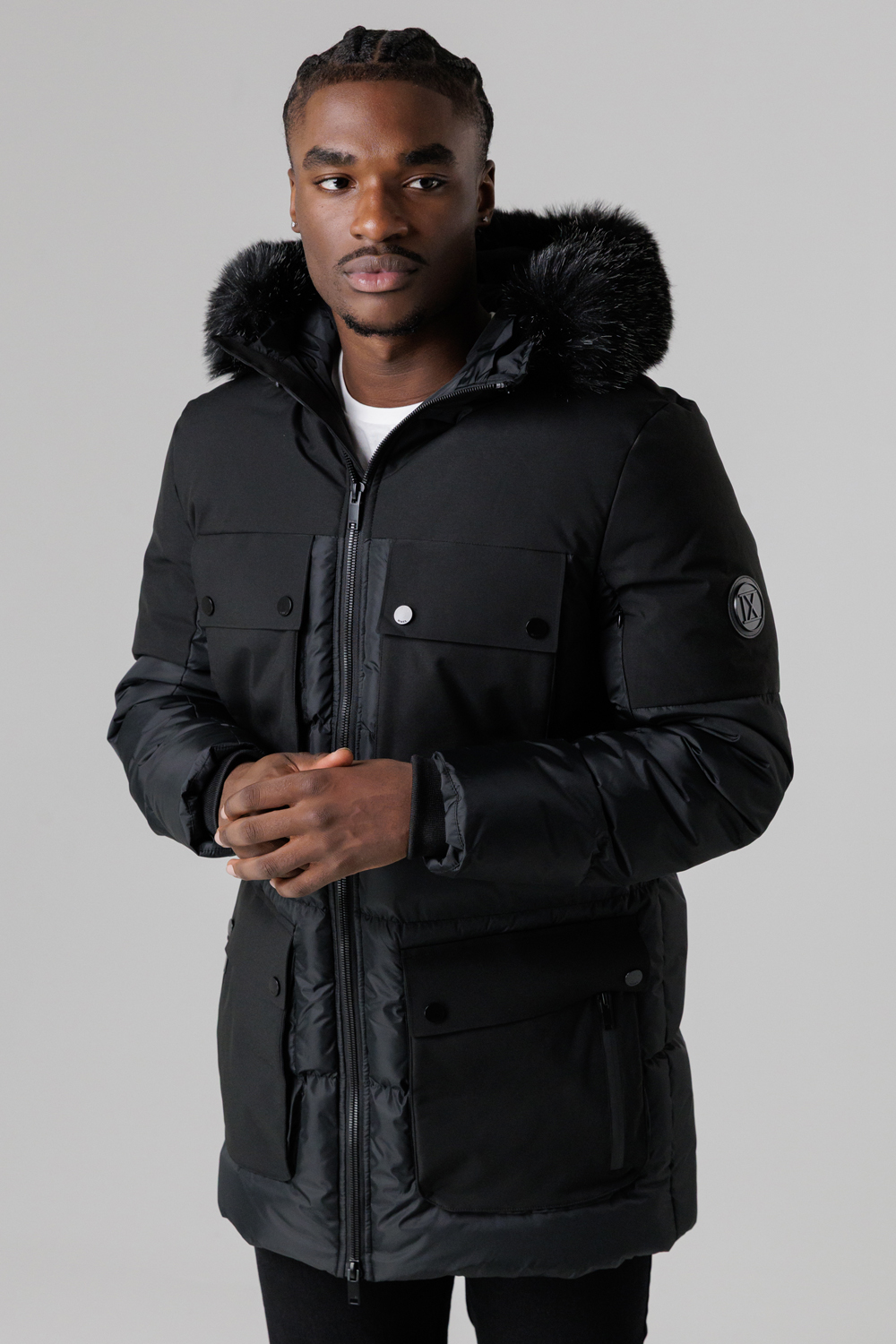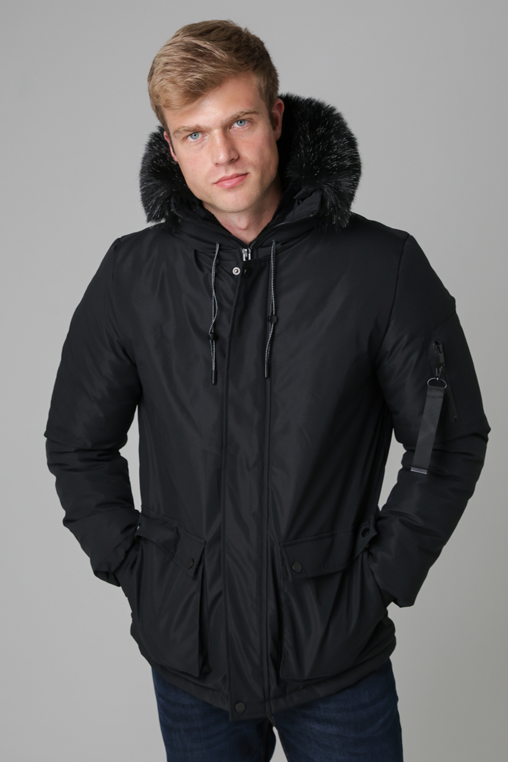 Black Fur Hooded Parka Jacket Men Winter Bomber Coat