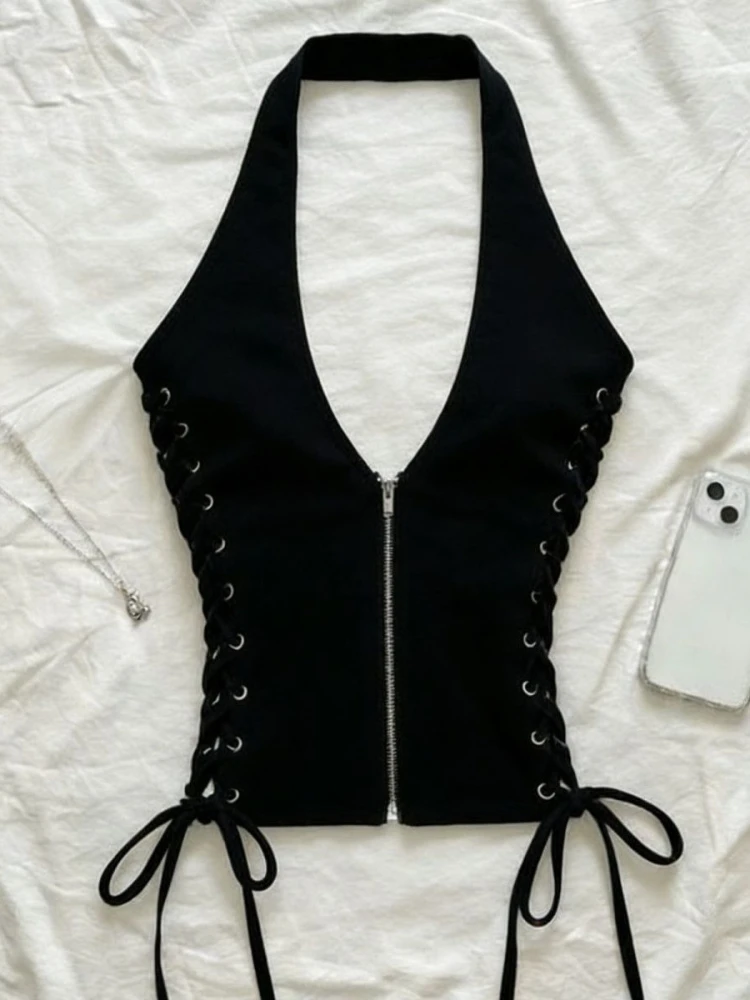 Subculture Aesthetic Darkly Slim Slash Neck Vest Women Hot Girl Sexy Y2k Lace Up Skinny Black Design...