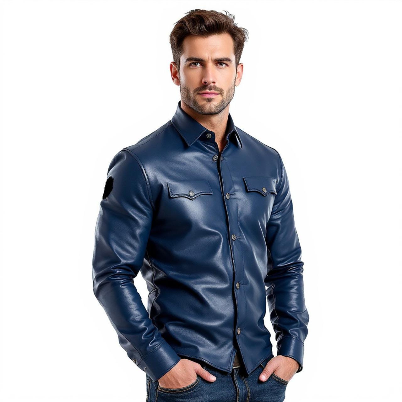 "Elevate your style with this timeless Men's Navy Blue Leather Shirt, designed for both sophist...