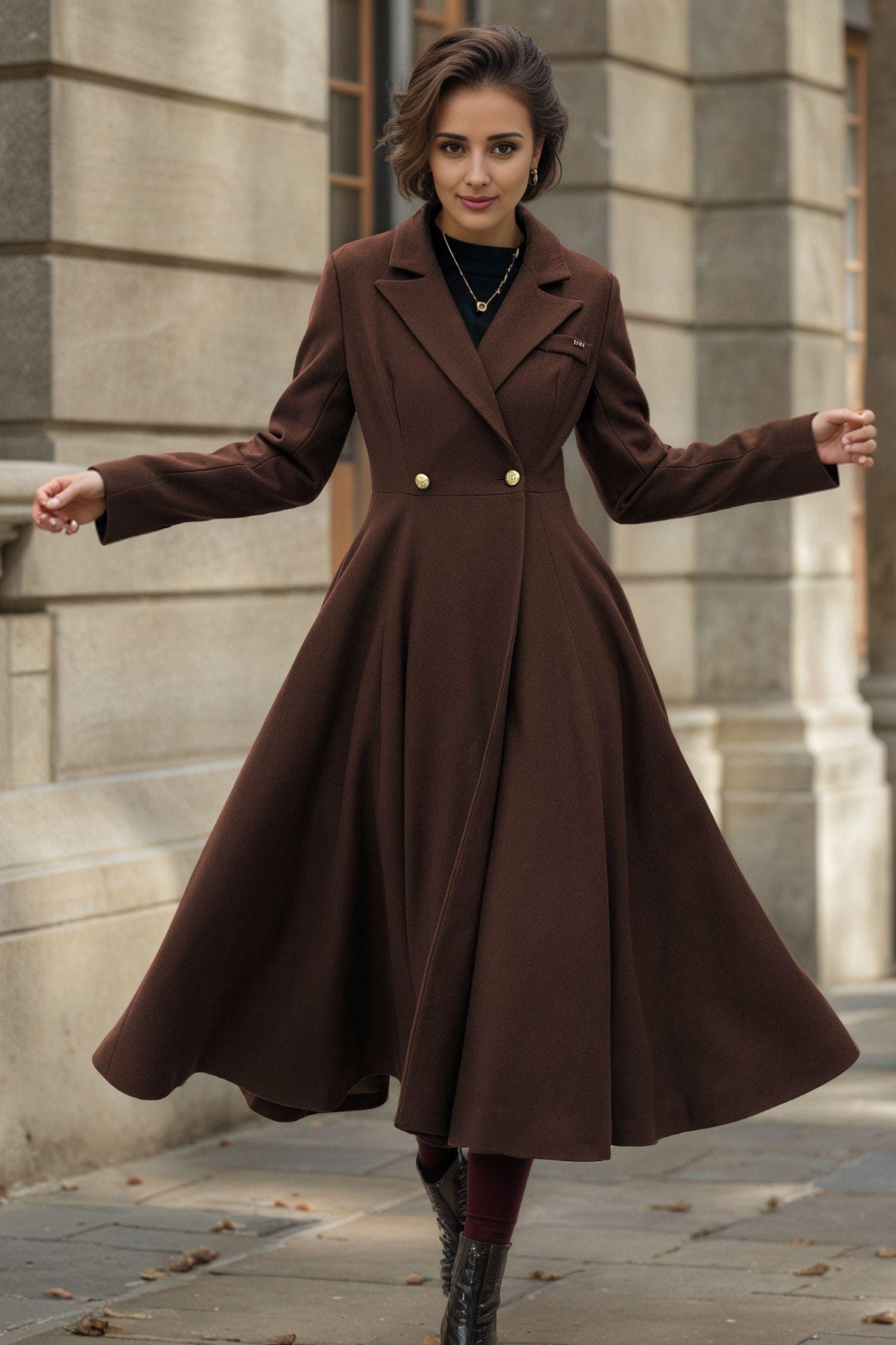 Brown Wool Blend Maxi Coat for Women, Stylish Double-Breasted Desig...