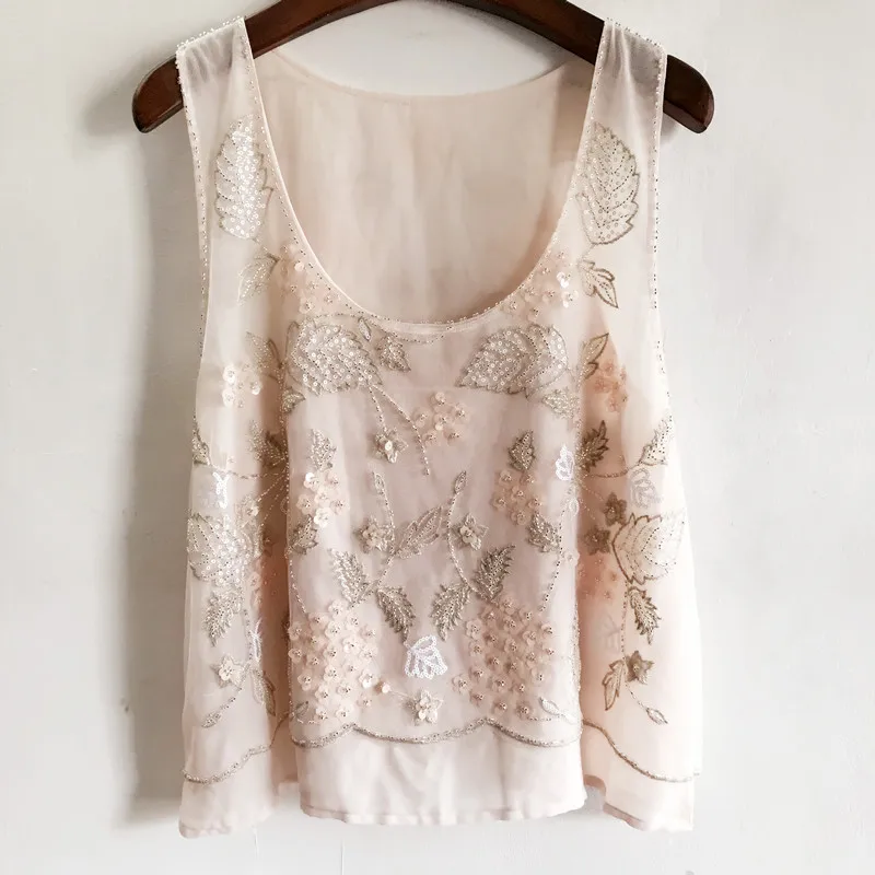 Women Floral Beaded Loose Vest Sleeveless Shirt Summer U-Neck Flowers Embroidered Sequined Chiffon B...