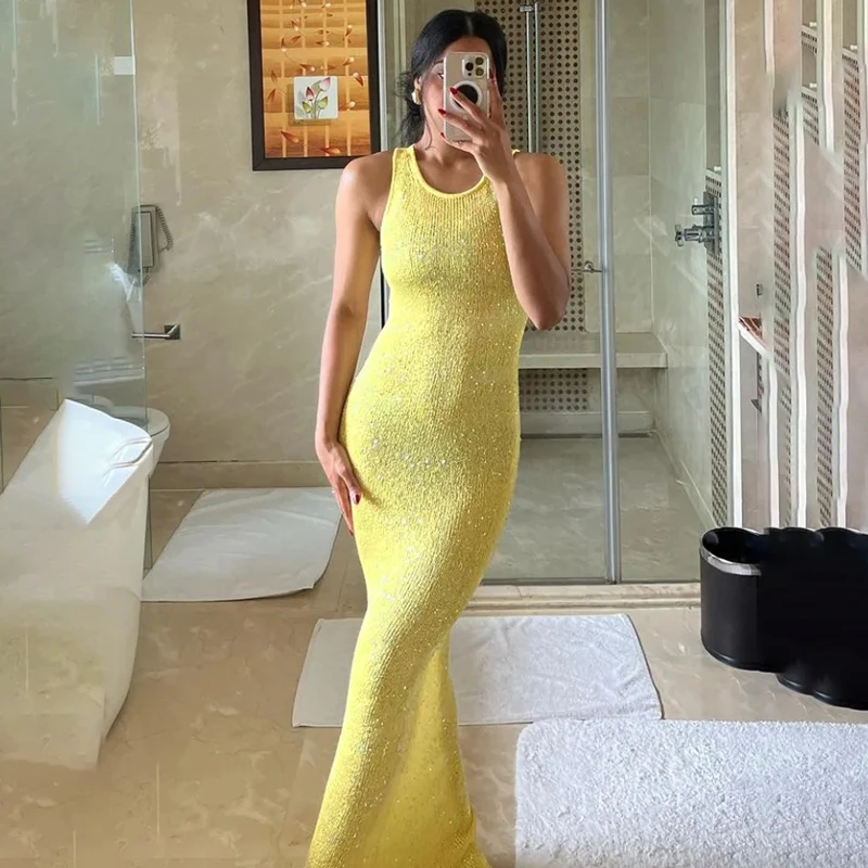 NHKDSASA See-Through Fashion Sleeveless Maxi Dress Female Casual Sequin Slim High Waist Streetwear V...