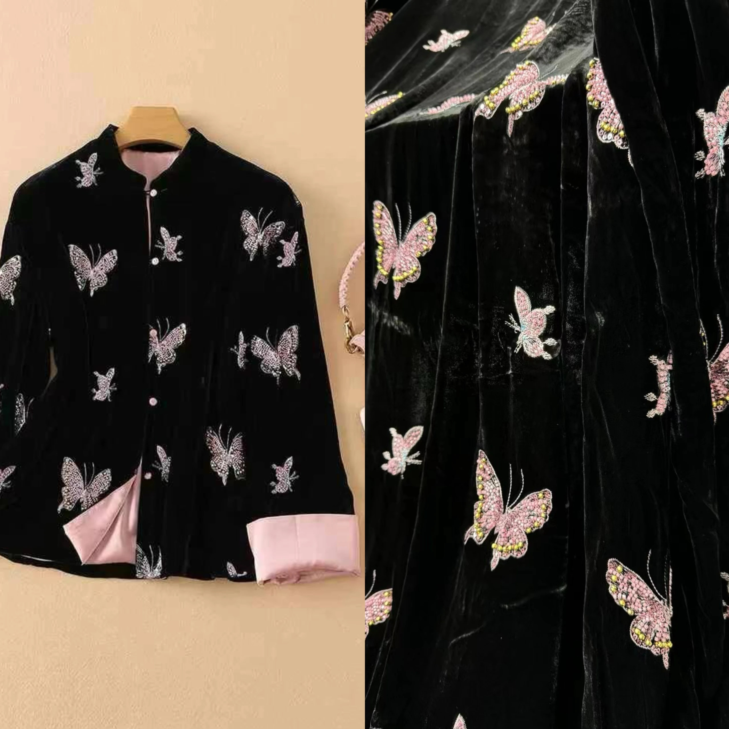 Butterfly Beads Embroidery Silk Velvet Fabric Black Autumn and Wint...