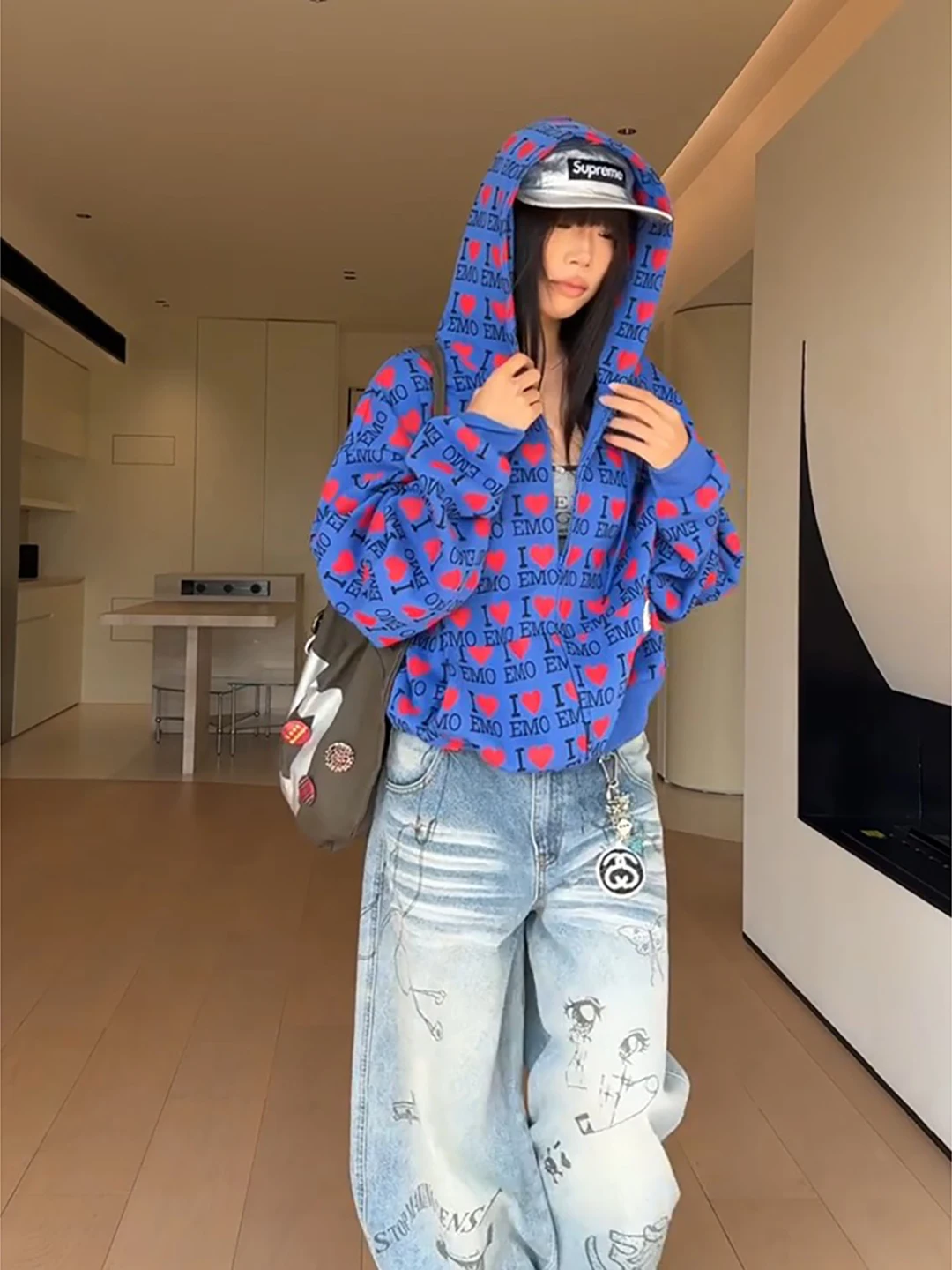 Retro American Blue Letter Heart Hoodie Women's Loose Casual Long Sleeve Autumn New Style Versatile ...