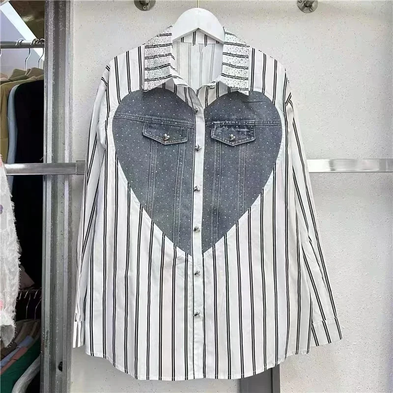 Fashion Hot Fix Denim Splicing Shirt Women's Blouse Mid Length Spring Summer Autumn Shirt 2025 New C...