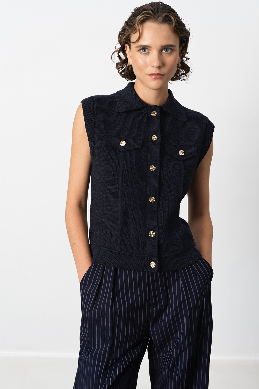 French Connection Womens Dark Indigo Knit Collared Button Gilet - B...