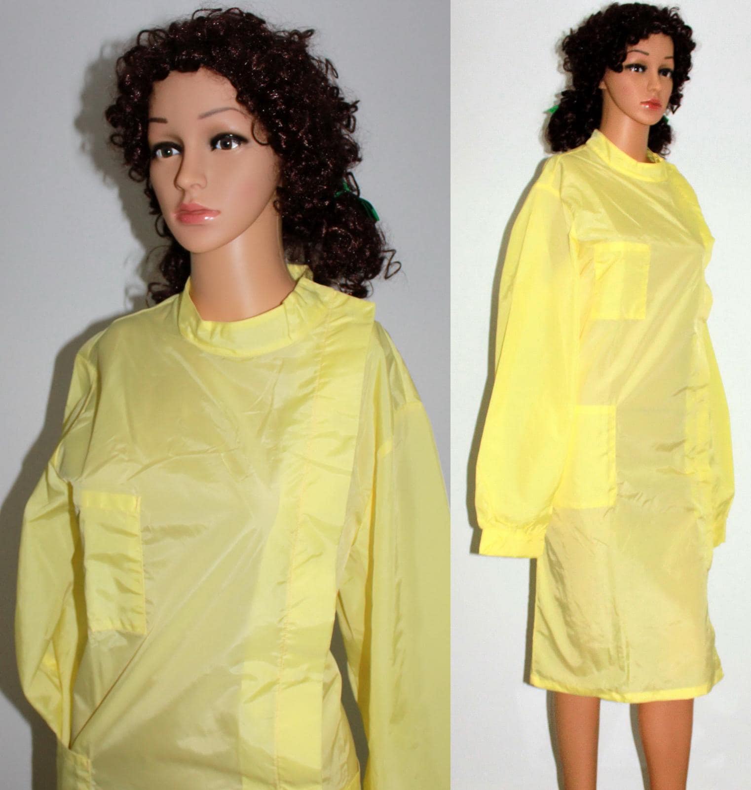 Extravagant, like-new, lemon-yellow nylon smock - hair salon, stiff vintage nylon salon work dress w...