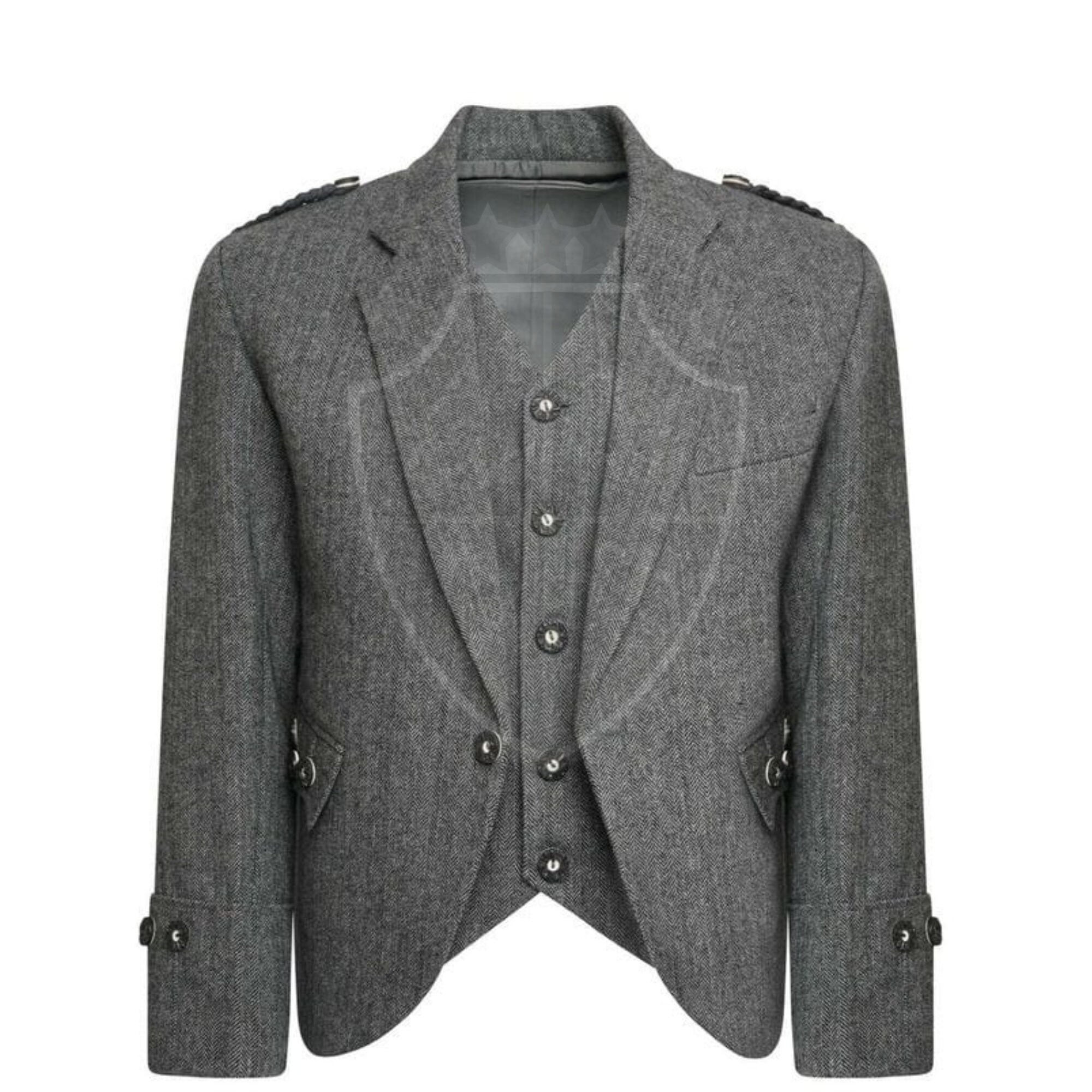 "Elevate your Highland look with this classic Gray Tweed Argyle Kilt Jacket for Men -- expertly...