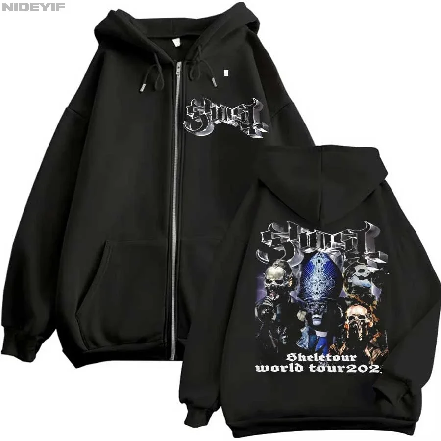 Band Ghost Skeletour World Tour 2025 Merch Hoodie Zipper Men Women Jacket Hiphop Streetwear Outfit S...