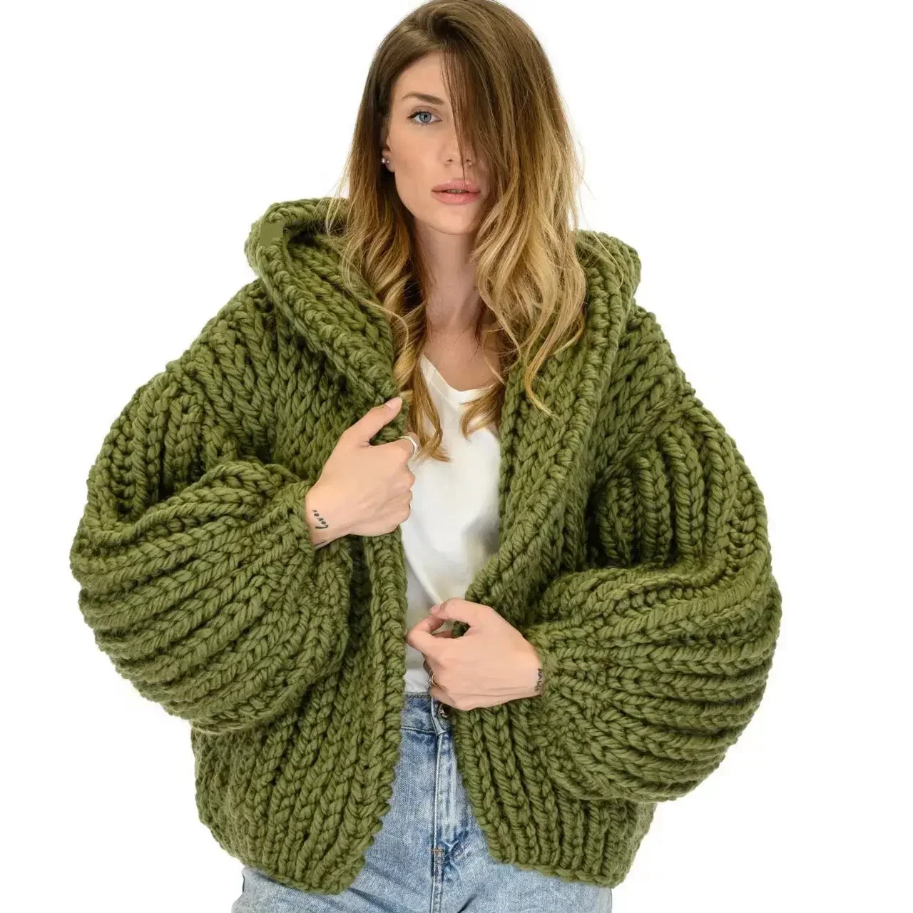 Chic Spring Autumn Women Thick Hooded Knitted Cardigan Coarse Wool Handmade Stick Sweater Coat with ...