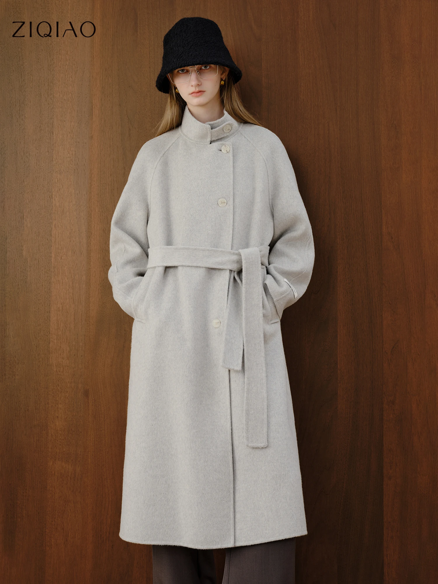 ZIQIAO Petite Size 2025 Autumn Winter Women's Stand Collar Cashmere Wool Blend Coat Long Tweed Overc...