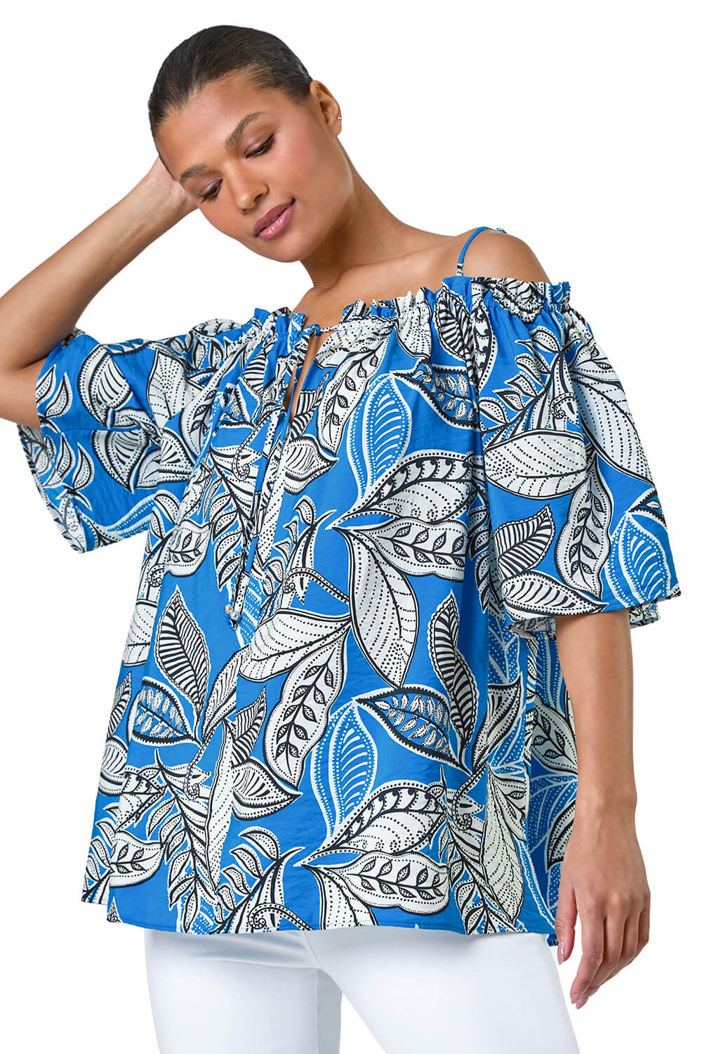 Leaf Print Cold Shoulder Bardot Top from Roman. Tap into the vibrant energy of the Summer season wit...